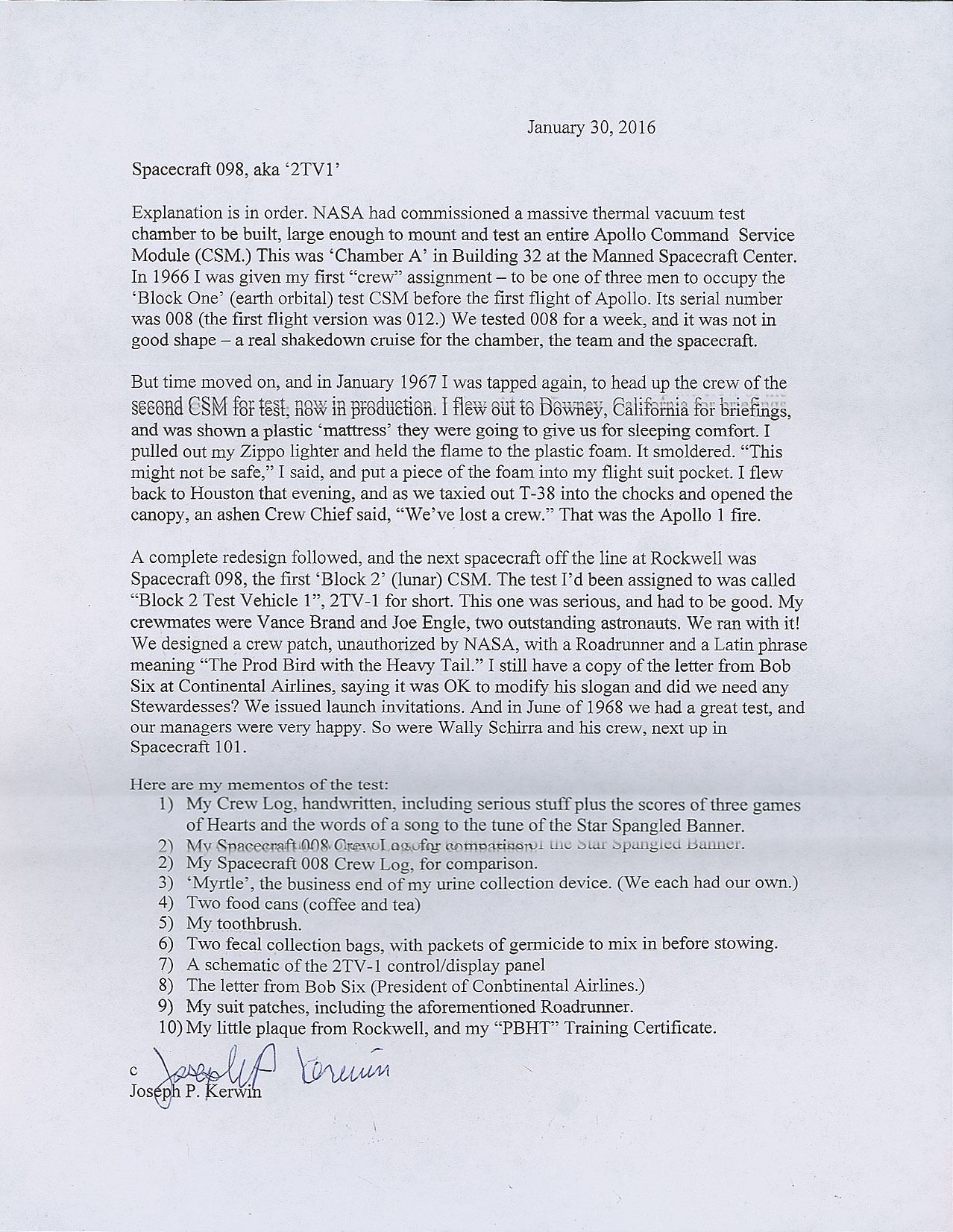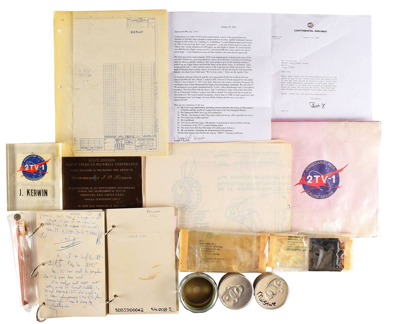 Accompanied by a signed provenance letter from Kerwin, in part: “NASA had commissioned a massive thermal vacuum test chamber to be built, large enough to mount and test an entire Apollo Command Service Module…This was ‘Chamber A’ in Building 32 at the Manned Spacecraft Center. In 1966 I was given my first ‘crew’ assignment—to be one of three men to occupy the ‘Block One’ (earth orbital) test CSM before the flight of Apollo. Its serial number was 008 (the first flight was 012). We tested 008 for a week, and it was not in good shape—a real shakedown cruise for the chamber, the team and the spacecraft.