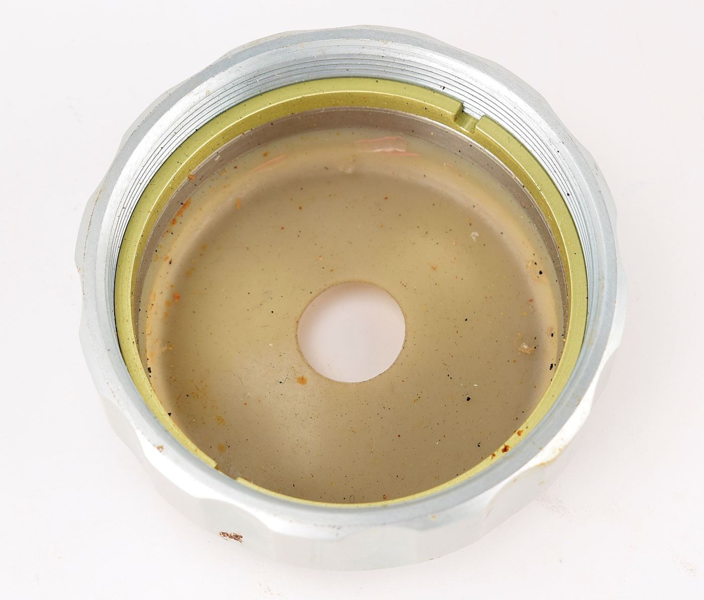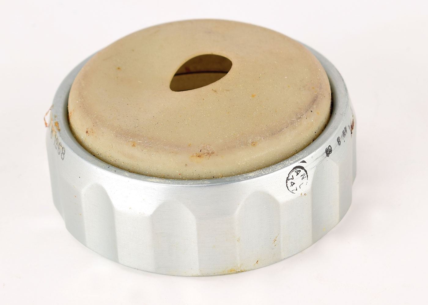 The rubber end cap for Kerwin’s urine collection device, 2.75 x 1.25, with metal base dated April 18, 1968, with stamped part numbers: “V36, 601470 11.”