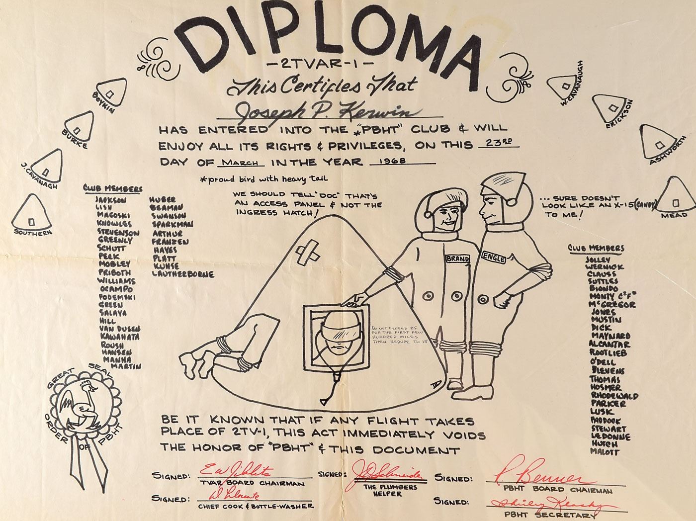A hand-made 22 x 17 diploma presented to Kerwin as a new member of the “PBHT Club,” issued on March 23, 1968, with a humorous sketch of Kerwin stuck inside the capsule with his stethoscope as Brand and Engle look on; with “Great Seal, Order of PBHT” to lower right, club member lists to either side, and lower portion signed by five board members.
