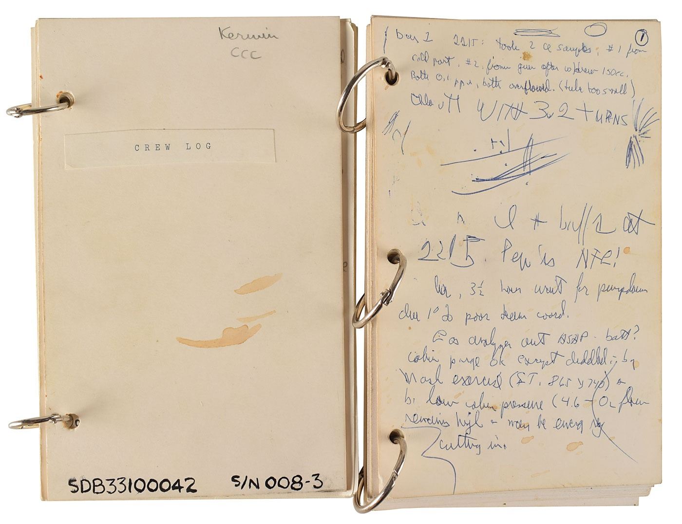 A 5 x 8 spiral-bound “Crew Log” for the testing of the CSM-008 in late October 1966, containing roughly 44 pages of handwritten notes made in ink and pencil by Kerwin, who adds his ownership name to the front cover, “Kerwin, CCC,” with part and serial numbers below: “SDB33100042, S/N 008–3.”
