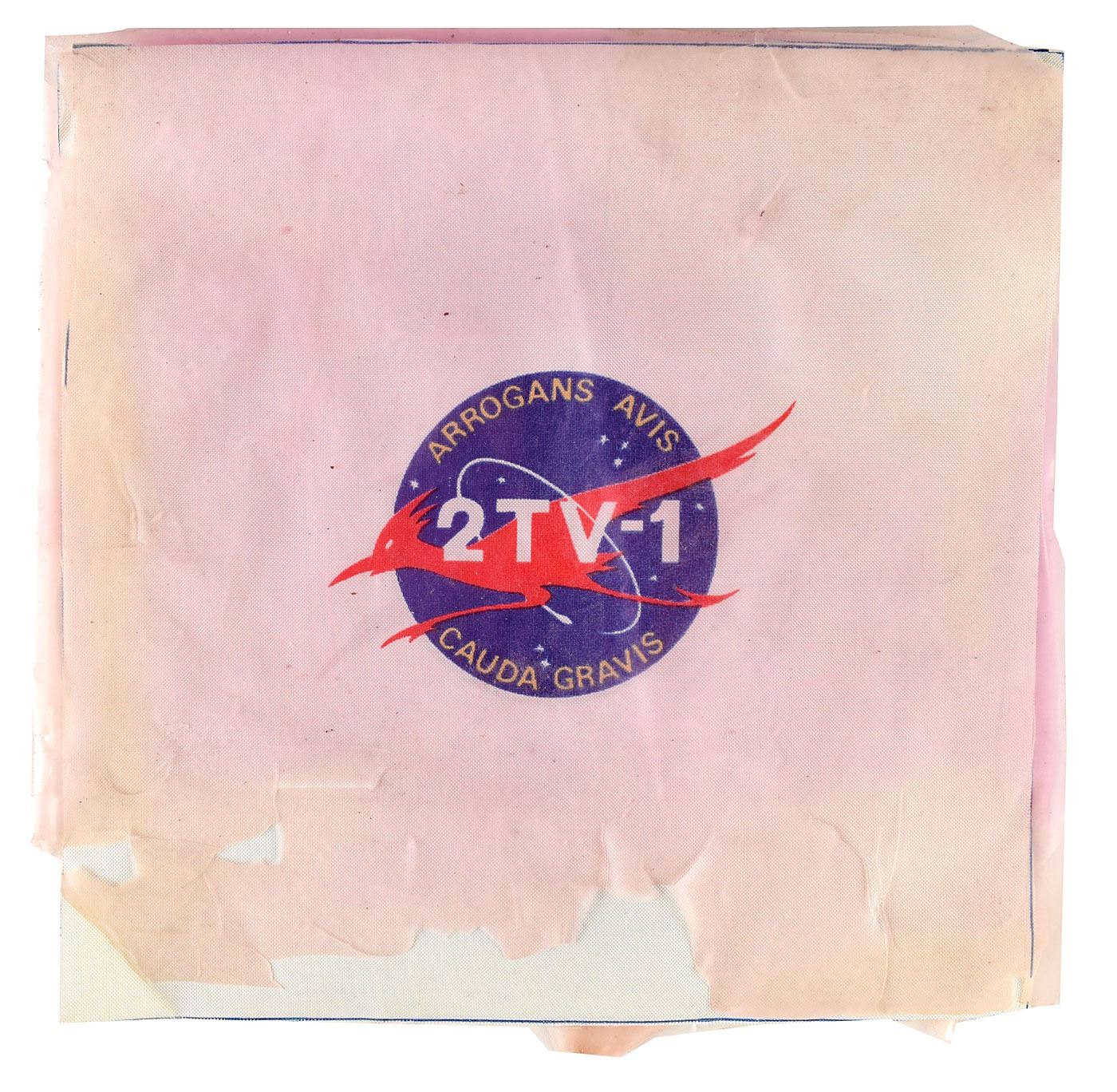 Uncommon pairing of off-white 9 x 9 swatches of Beta cloth featuring the unauthorized mission emblem of the 2TV-1 crew, with red roadrunner bird and yellow Latin text: “Arrogans Avis Cauda Gravis,” which translates to “The Proud Bird with the Heavy Tail.”