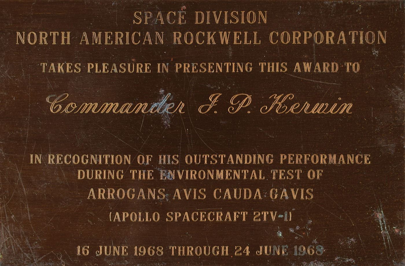 A metal 6 x 4 plaque from the Space Division at North American Rockwell presented to “Commander J. P. Kerwin, in recognition of his outstanding performance during the environmental test of Arrogans Avis Cauda Gavis [sic], Apollo Spacecraft 2TV-1.”