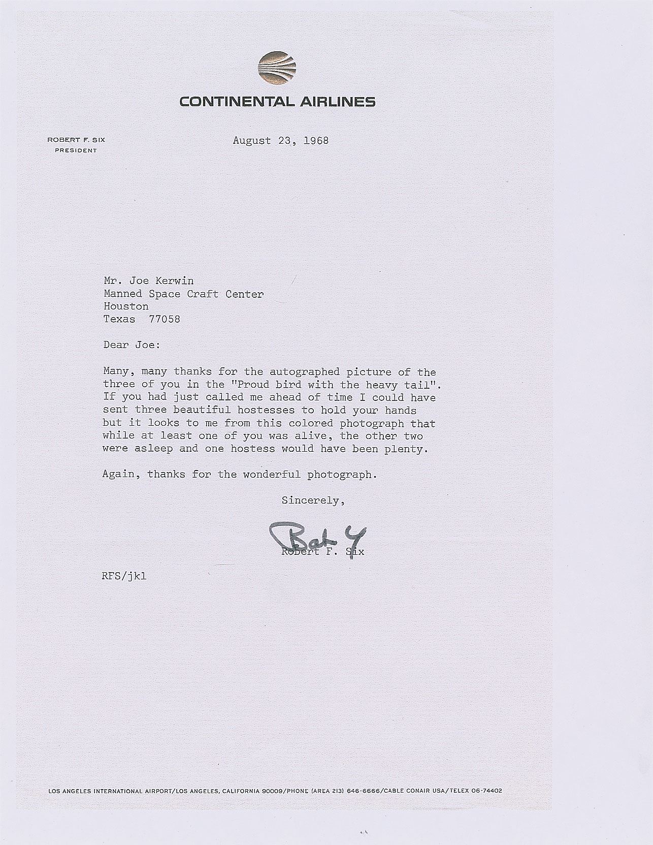 A TLS from Robert Six, the CEO of Continental Airlines, signed “Bobby,” one page, 8.5 x 11, personal Continental Airlines letterhead, August 23, 1968, allowing Kerwin and the 2TV-1 crew to modify the Continental Airlines slogan—‘The Proud Bird with the Golden Tail’—for use on their patches. The letter, in part: “Many, many thanks for the autographed picture of the three of you in the ‘Proud bird with the heavy tail.’ If you had just called me ahead of time I could have sent three beautiful hostesses to hold your hands.” In overall very good to fine condition, with expected wear from use and age.