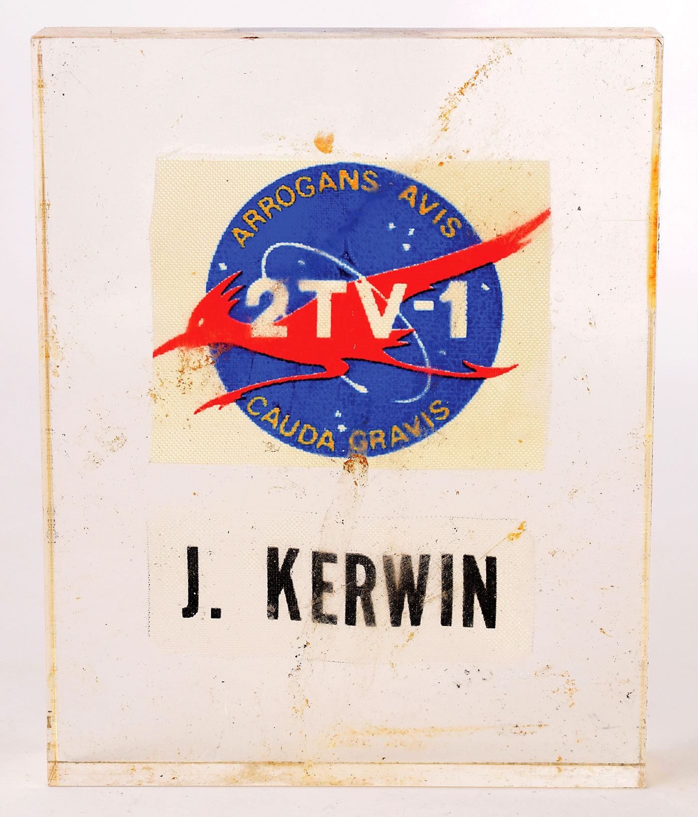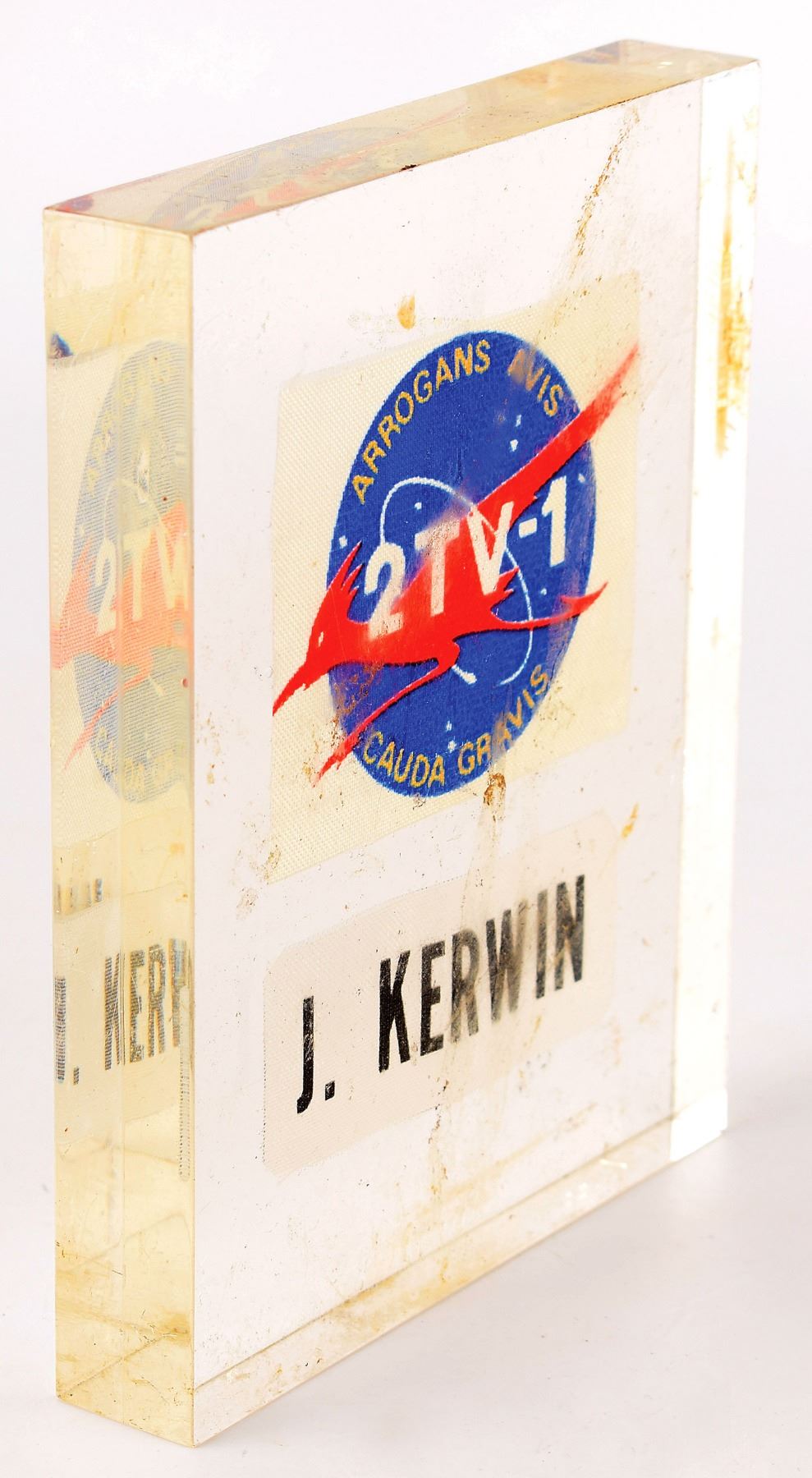 Lucite display, 4 x 5 x .75, containing Kerwin’s suit name patch, “J. Kerwin,” and his 2TV-1 Beta emblem patch.