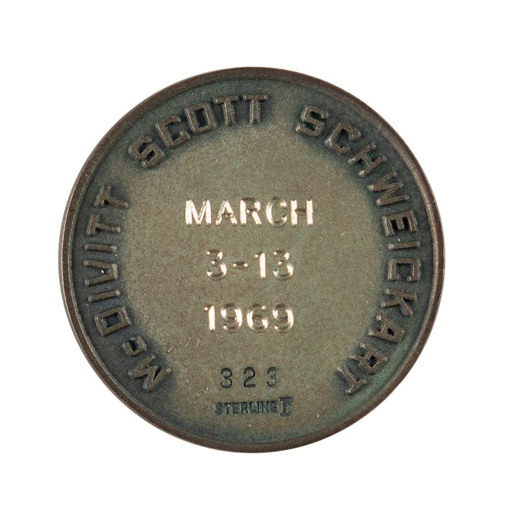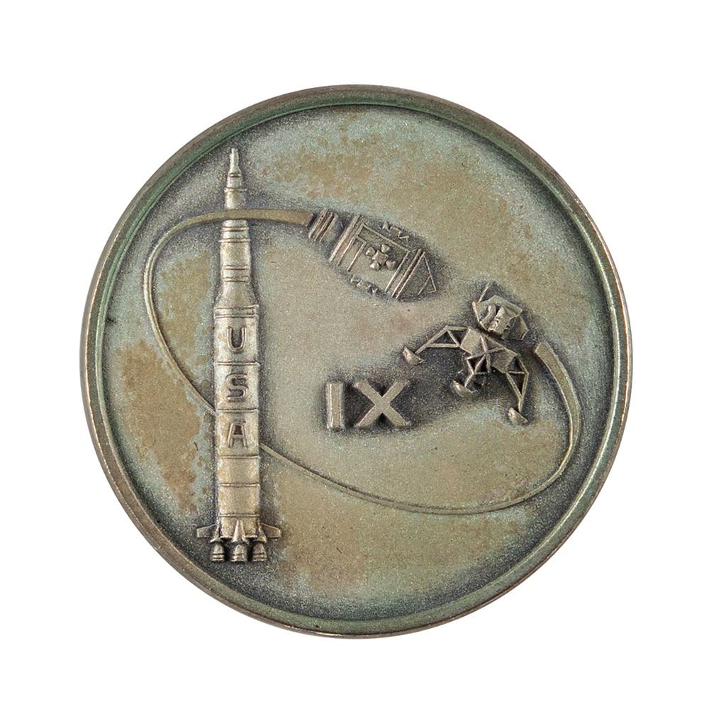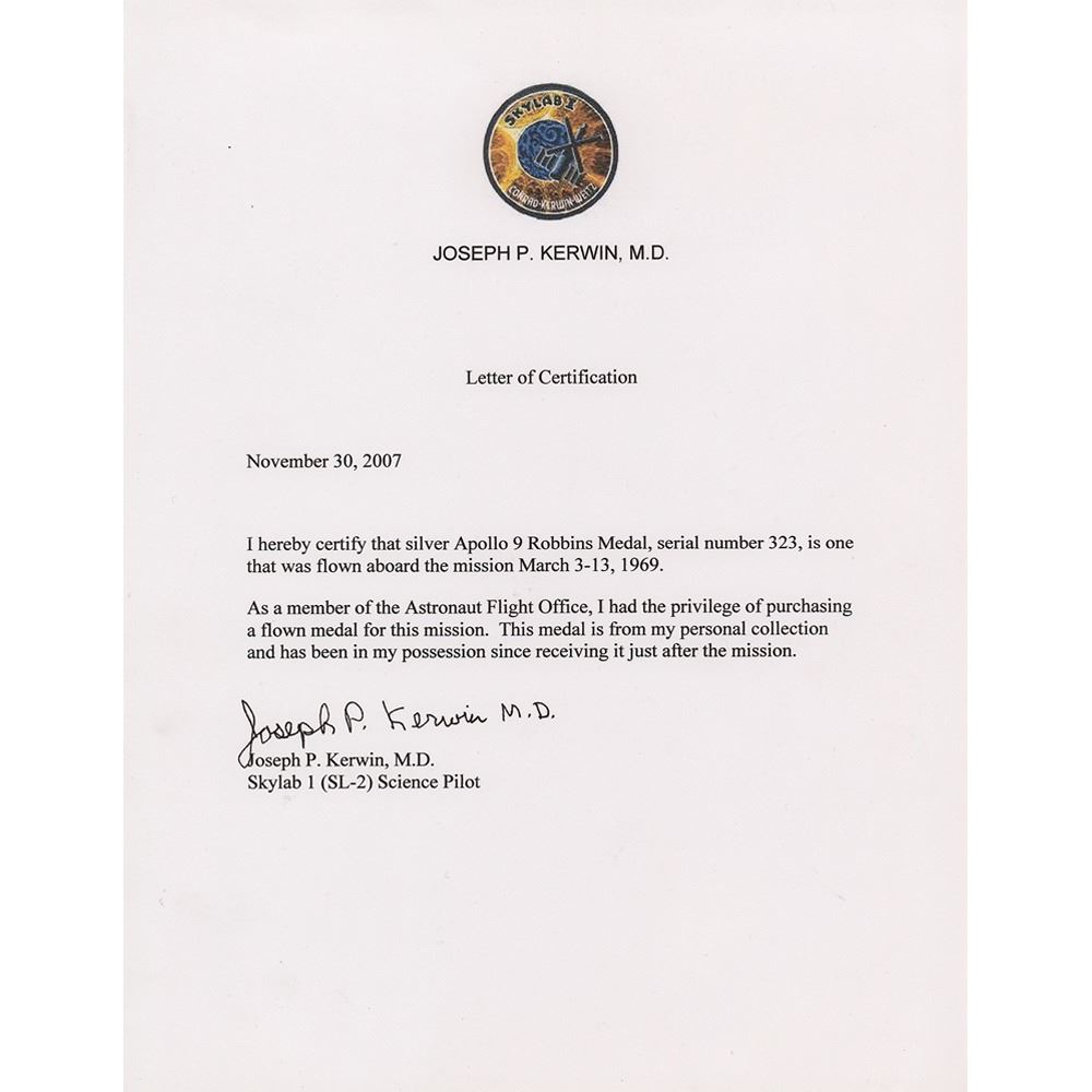 Flown sterling silver Apollo 9 Robbins medallion, approximately 1˝ in diameter, with a raised design of the mission insignia on the face—the orbiting CM and LM with Saturn V launch vehicle, and mission number "IX" at center. The reverse is engraved with the mission dates, "March 3–13, 1969," and encircled by the surnames of the astronauts in raised text: "McDivitt, Scott, Schweickart." The medal is serial numbered "323" and stamped below with the Robbins "Sterling" hallmark. Encapsulated and graded by NGC as "MS 65," with the label noting the provenance, "Ex. Joseph P. Kerwin." Accompanied by its original case and a letter of provenance signed by Joe Kerwin, in part: "As a member of the Astronaut Flight Office, I had the privilege of purchasing a flown medal for this mission. This medal is from my personal collection." Selected for NASA Astronaut Group 4 as a scientist-astronaut in June 1965, Kerwin would go on to serve as Science Pilot for the Skylab 2 mission in 1973.