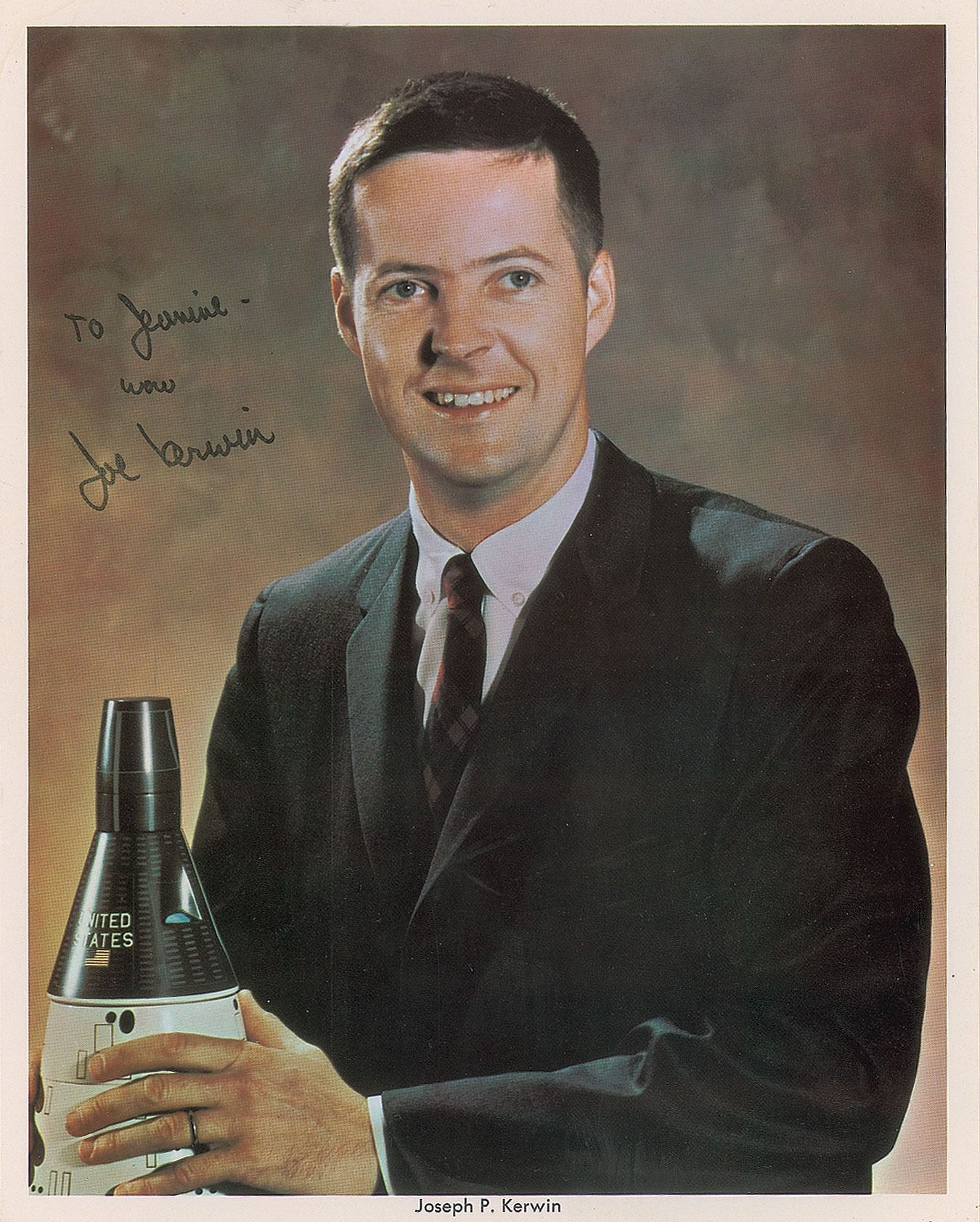 Uncommon official color 8 x 10 NASA lithograph of Kerwin posing with a capsule model, signed and inscribed in black felt tip, "To Jeanine, wow, Joe Kerwin.” In very fine condition. Recipient was an employee at the Los Angeles International Airport who assisted astronauts with picking up their GSA vehicles circa 1967.