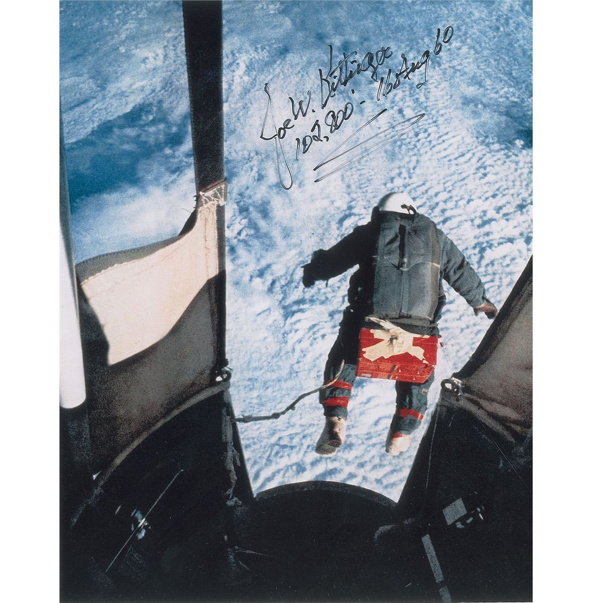 Color glossy 8 x 10 photo of Kittinger performing his then record-breaking skydive, signed in black felt tip, “Joe W. Kittinger, 102,800 ft—16 Aug 60.” In fine condition.