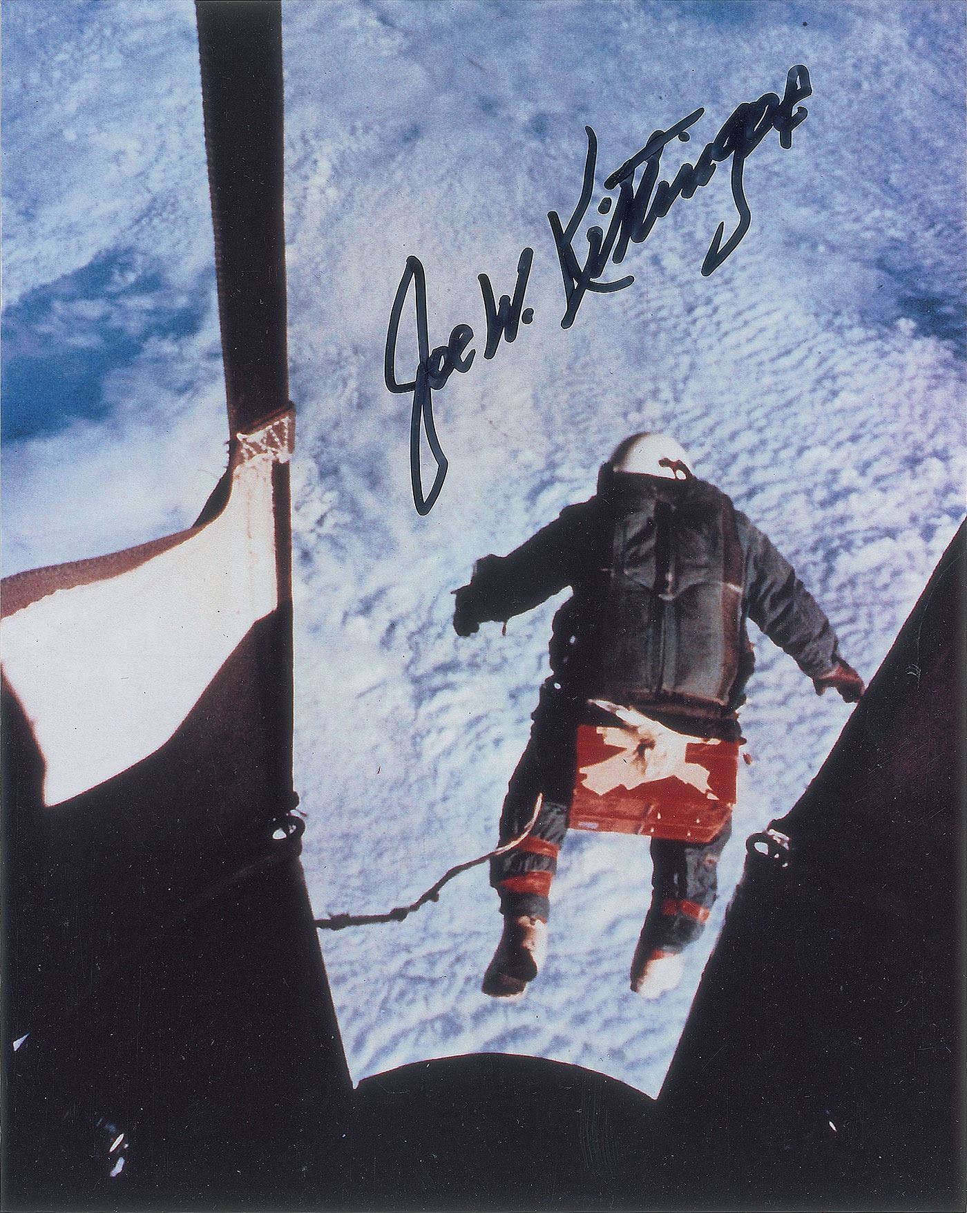 Color glossy 8 x 10 photo of Kittinger performing his then record-breaking skydive, signed in black felt tip, “Joe W. Kittinger." In fine condition.