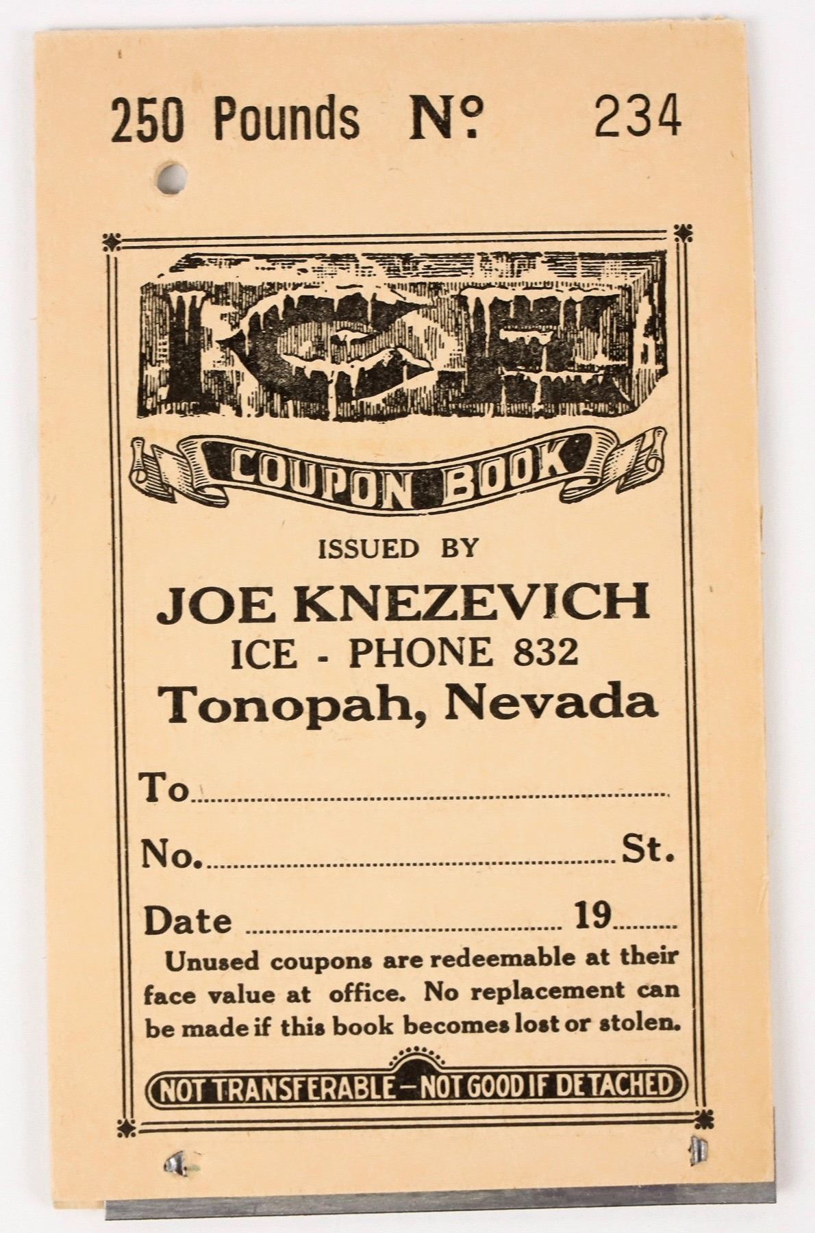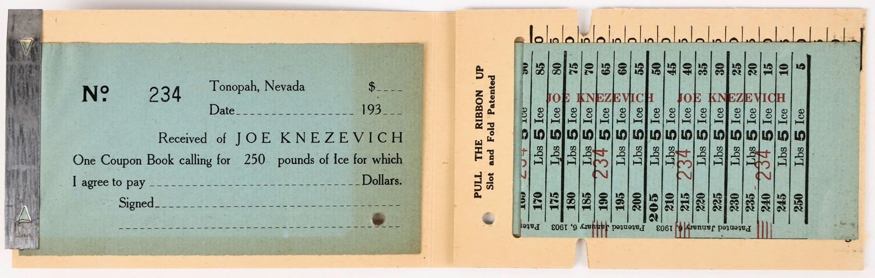 Booklet of scrip for 250 lbs. of ice, Tonopah, 1930s. 5 x 3"