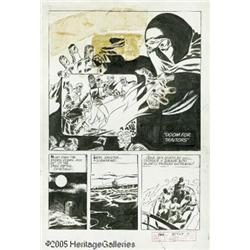 <B>Joe Kubert - Speed Comics #36, page 1 Original Art (Harvey, 1945).</B></I> If you were lucky enough to pick <B>Speed Comics</B></I> #36 up right off the stands, you would have been amazed to find this cinematic Joe Kubert Black Cat splash page for the story, "Doom for Traitors." Cloaked in half-light and stark shadows, Kubert places an emphasis on the lit areas, and all eyes are led to the panel featuring the Black Cat. While a menacing hooded figure hovers above, the Black Cat is held hostage, doomed to be burnt at the stake. Also, look on the back of the page and you'll find some interesting layout doodles in blue pencil -- it's all part of the creative process! The art has a 12.5" x 18" image area. The first frame has a stain from a missing paste-up, and some residual glue staining, but otherwise the art is in Very Good condition.