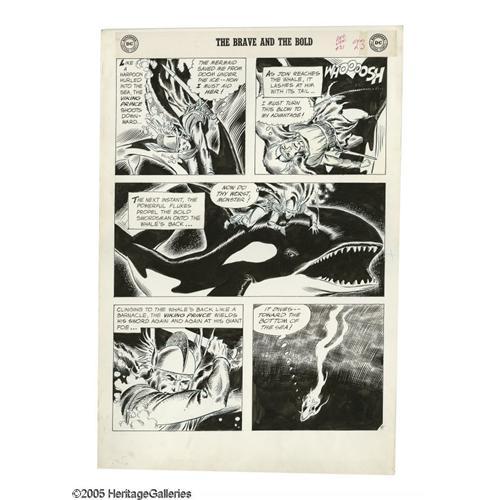 <B>Joe Kubert - The Brave and the Bold #21, page 23 Original Art (DC, 1958).</B></I> Like a harpoon hurled into the sea, the Viking Prince rides a killer whale downward to the bottom of the sea, in a valiant effort to save a mermaid, in this page from the Bob Haney story, "The Viking and the Firebird". You'll be entranced by Joe Kubert's phenomenal pencils and inks in this Silver Age showcase. With an image area of 13" x 18", the art is in Excellent condition.