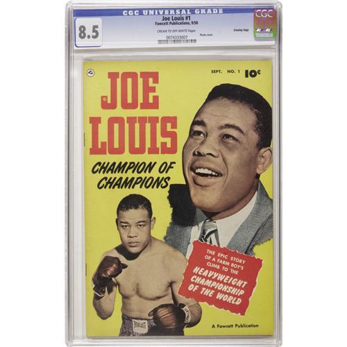 <B>Joe Louis #1 Crowley Copy pedigree (Fawcett, 1950) CGC VF+ 8.5 Cream to off-white pages.</B></I> This issue features the life story of "the Brown Bomber" and a photo cover. Overstreet 2006 VF 8.0 value = $350; VF/NM 9.0 value = $555. CGC census 10/06: 1 in 8.5, 1 higher.<BR><BR><b>Shipping:</b> Slabbed Comic (<a target="_blank" href="http://www.heritageauctions.com/common/shipping.php">view shipping information</a>)