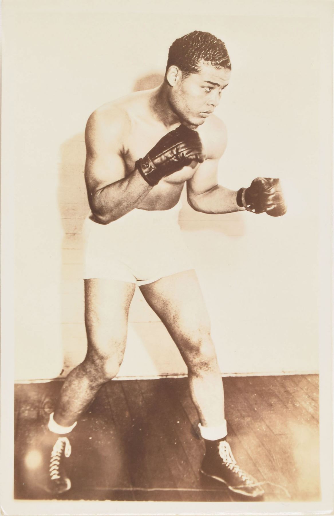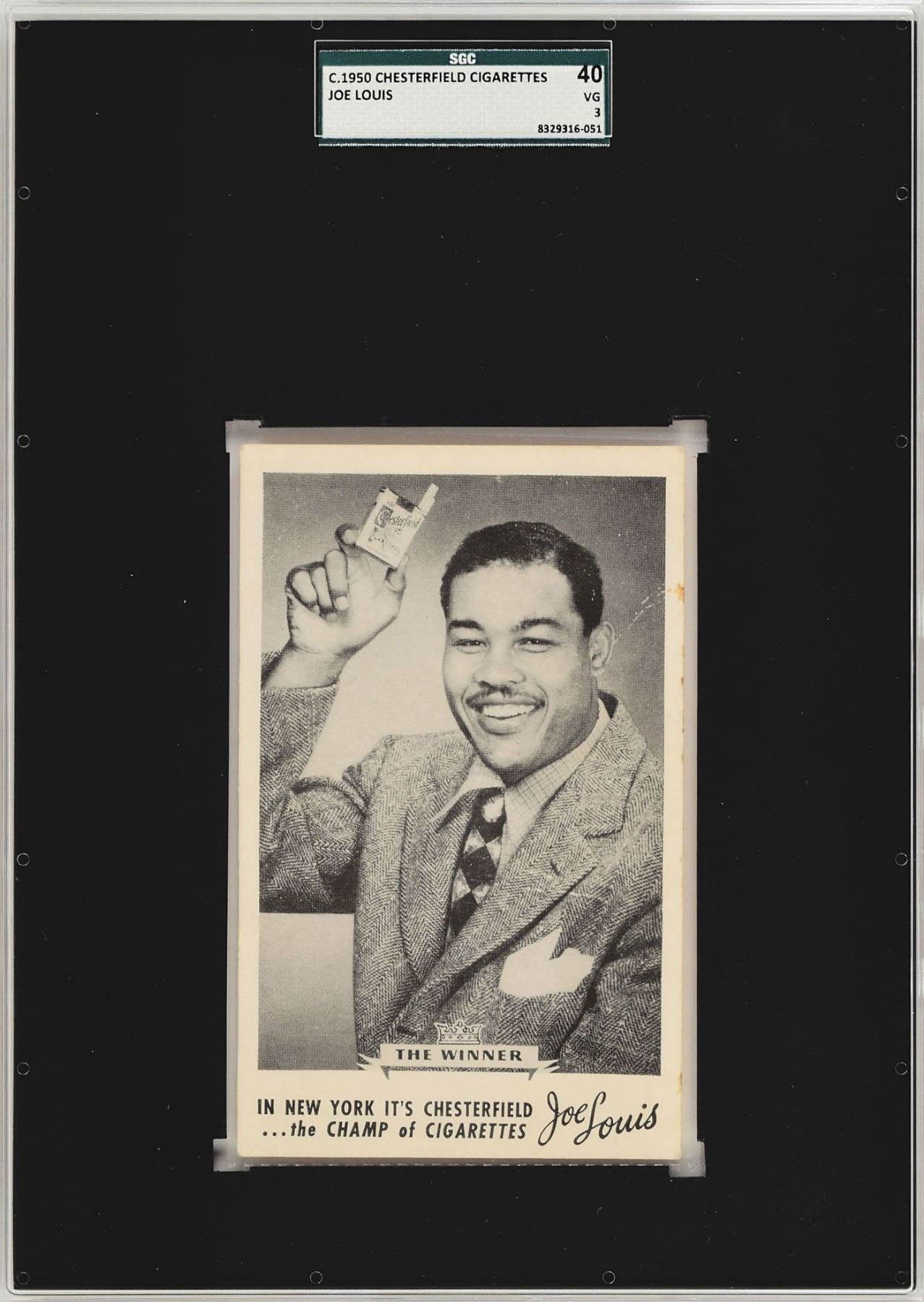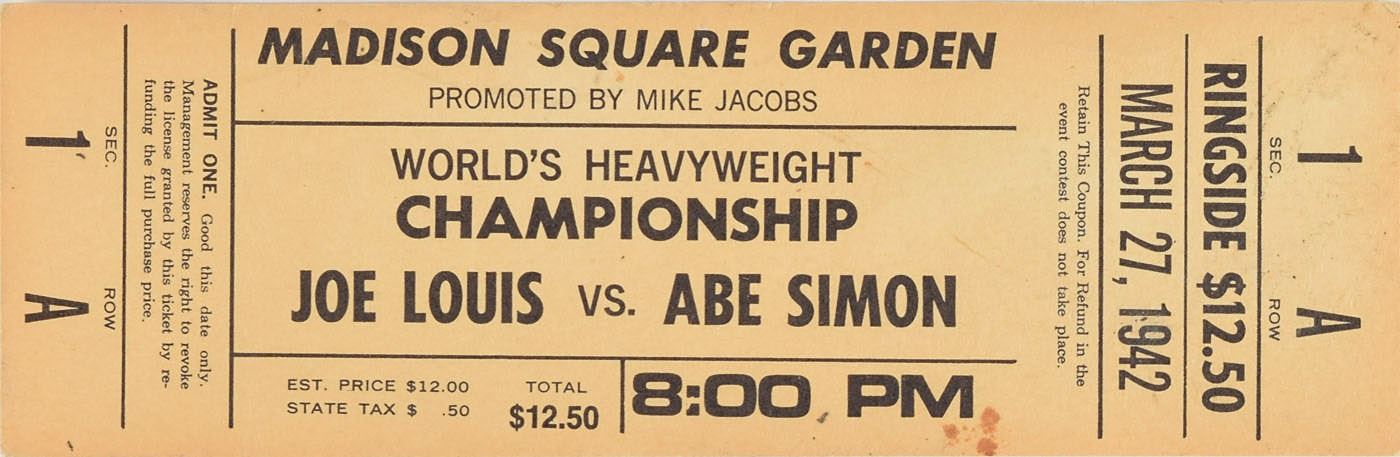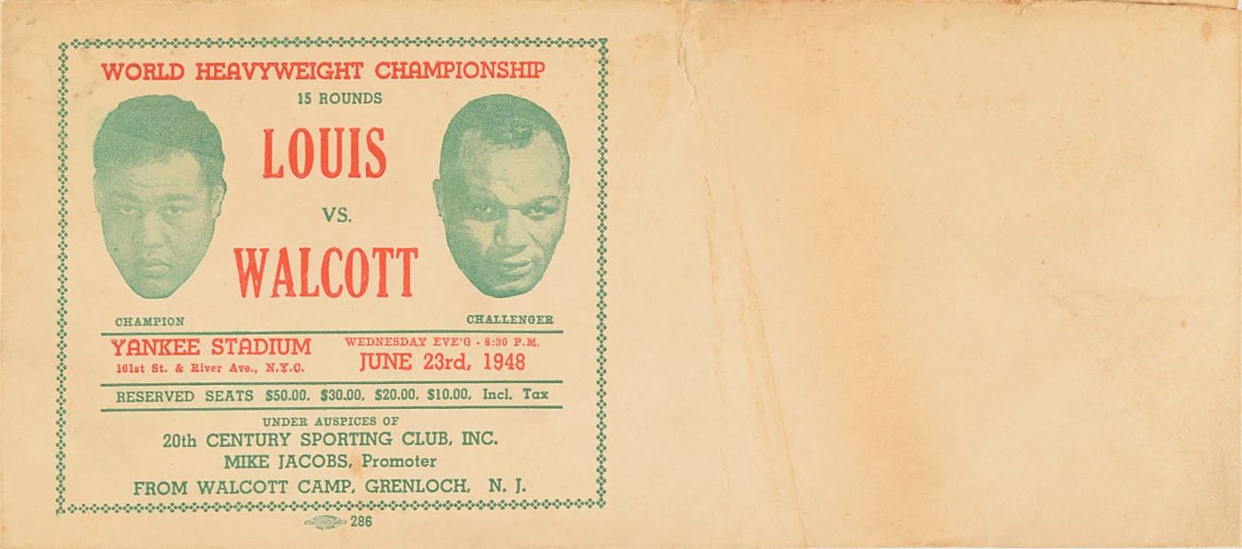 Collection of five Joe Louis items, highlighted by a ballpoint signature, “Joe Louis,” on an off-white card, also signed on the reverse by HOF sportswriter Jim Murray (encapsulated in an SGC authentication holder). The four unsigned items include: an unused circa 1930s real photo postcard of Louis; a ticket for the heavyweight championship between Louis and Abe Simon at Madison Square Garden on March 27, 1942; an advertising envelope for the Louis vs. Jersey Joe Walcott heavyweight championship at Yankee Stadium on June 23, 1948; and a circa 1950 Chesterfield advertising card featuring Louis, graded SGC 40. In overall very good to fine condition, with edge toning to the signature.