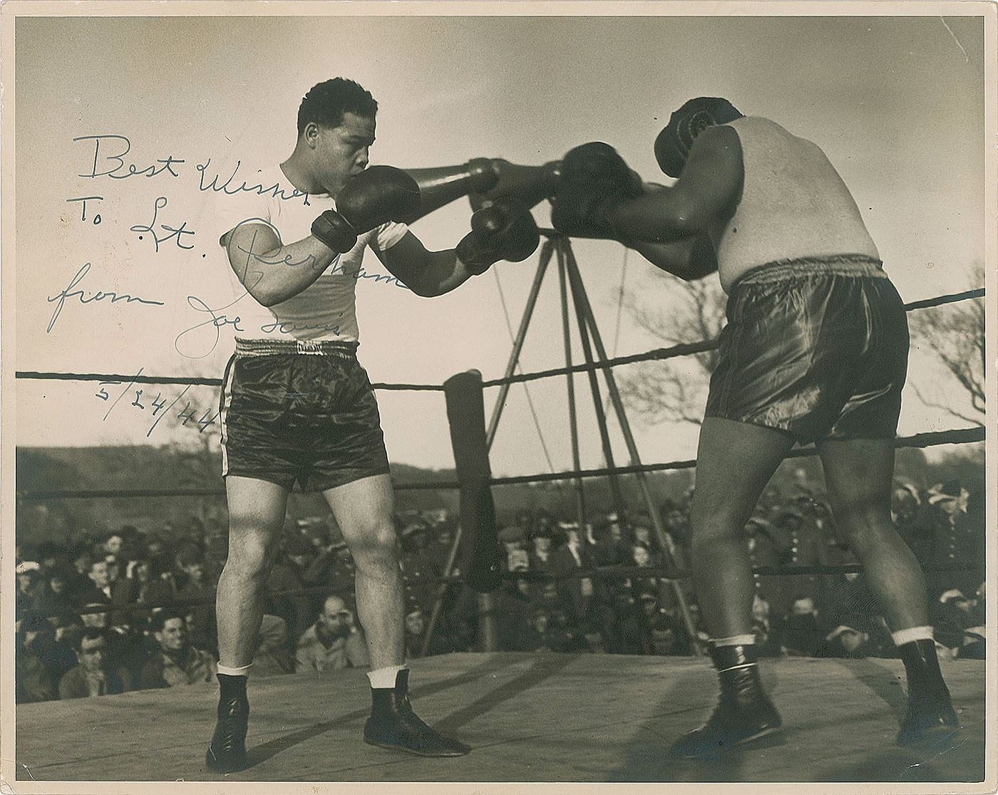 Vintage matte-finish 9.75 x 7.75 photo of Louis boxing in the ring, signed and inscribed in fountain pen, "Best Wishes to Lt. Perham, from Joe Louis, 5/24/44.” Reverse bears a "G. G. Holt" photographer's credit stamp. In very good to fine condition, with scattered creasing, a bit of light silvering, and a small gouge to Louis's trunks. Accompanied by a full letter of authenticity from JSA.