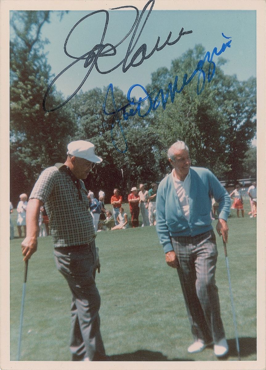 Scarce color textured semi-glossy 5 x 7 photo of Joe Louis and Joe DiMaggio standing side-by-side on a golf course, signed in black felt tip by Louis, and in blue felt tip by DiMaggio. In fine condition.