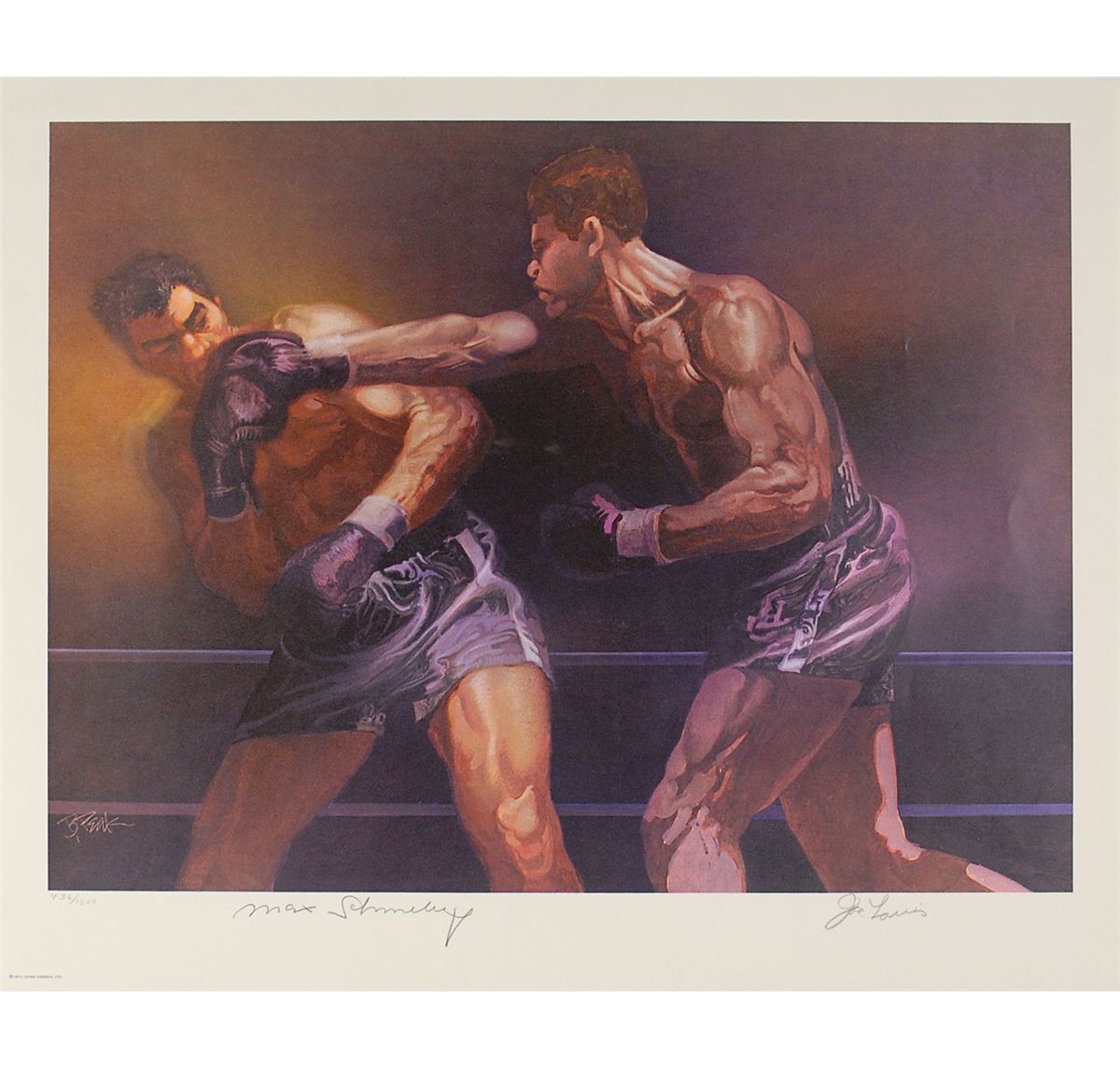 Color limited edition 22 x 18 print of an artful representation of Louis throwing a punch at Schmeling, numbered 436/1500, signed in the lower border in pencil by both. In fine condition, with mild creases. These difficult-to-find prints were issued in the 1970s by Sports Illustrated.