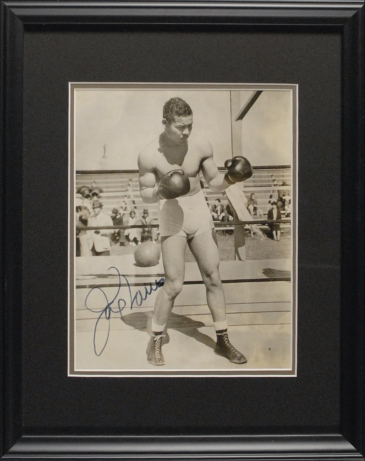 Glossy 8 x 10 photo of a young Louis training in the ring, signed in black felt tip. Double matted and framed to an overall size of 12 x 15.25. Consignor notes there is a notation on the reverse of the photo which reads, “Signed March 26, 1966, Toronto.” Scattered creases, a small brush to signature, and scattered light discoloration to emulsion, otherwise very good condition.