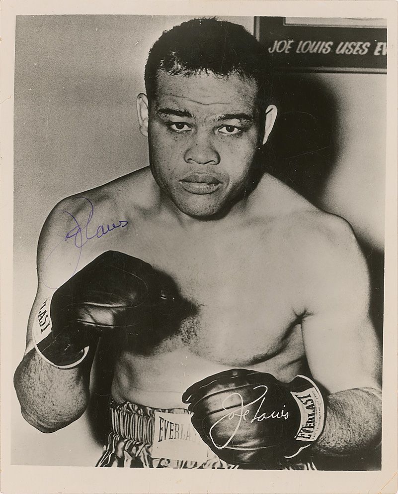 Glossy 8 x 10 photo of Louis ready to fight, signed in purple ink. Scattered moderate creasing throughout, a heavy central vertical crease, and a tear to the upper left, fixed with tape on reverse, otherwise very good condition.
