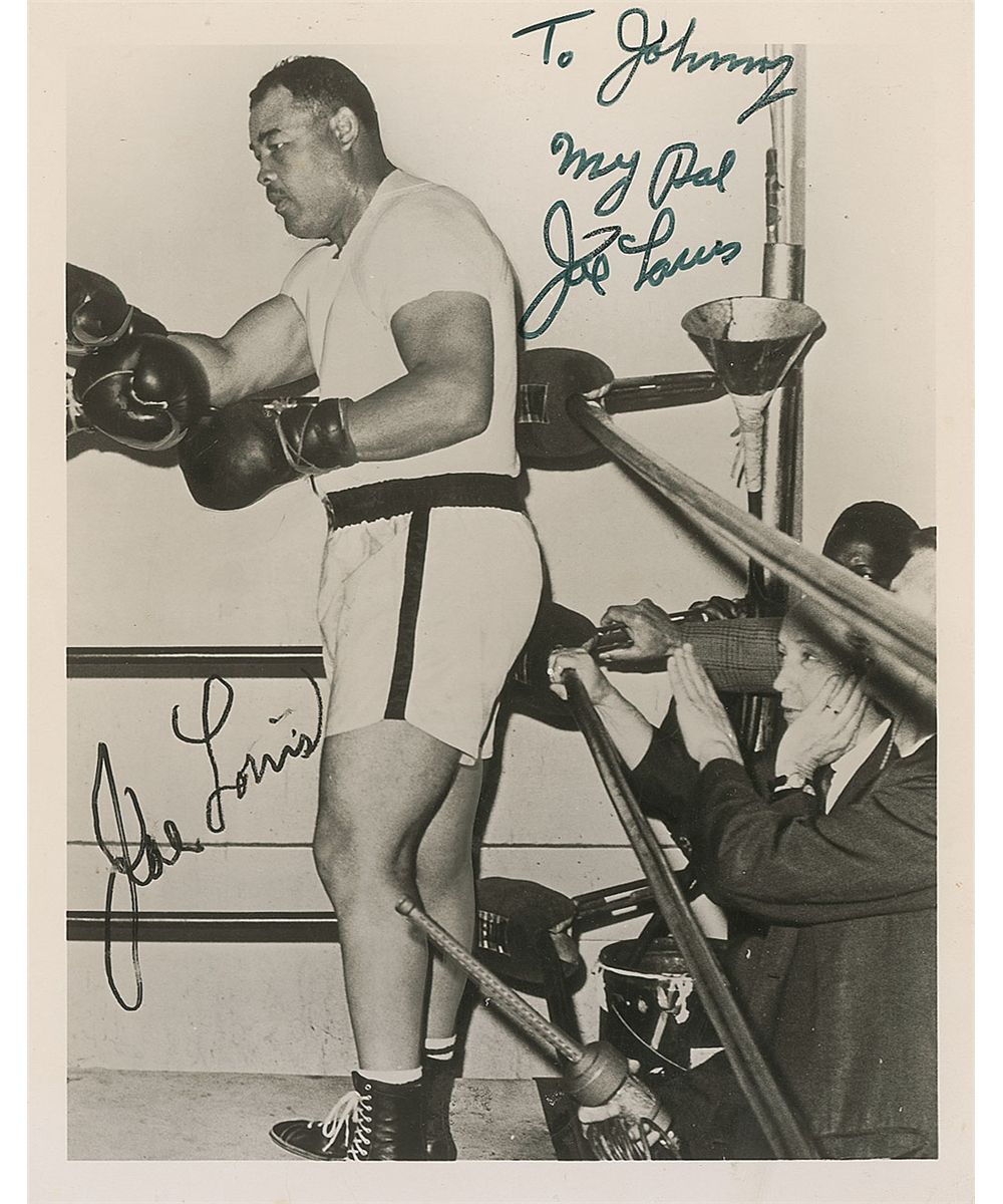 Glossy 8 x 10 photo of Louis training in the ring, signed and inscribed in black felt tip to Johnny Weissmuller, “To Johnny, my pal. Joe Louis.” Photo also bears an inherent, pre-printed signature to the lower left. A few bends and slight creases, otherwise fine condition. Originates from the estate of Weissmuller’s stepdaughter, Lisa Weissmuller Gallagher.