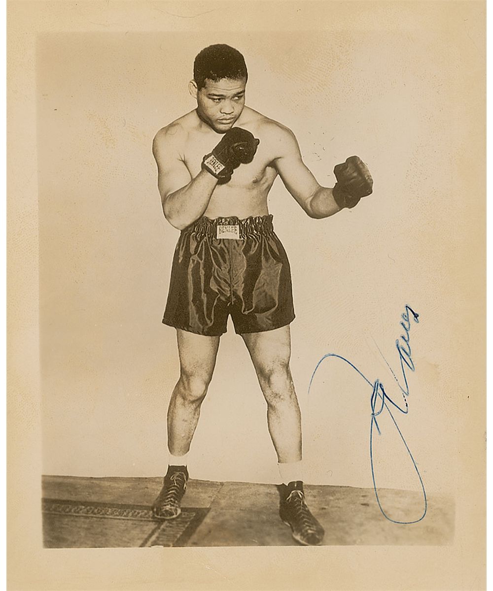 Vintage glossy 4 x 5 photo of Louis posing in Ben Lee boxing gear, signed vertically in fountain pen. A few light creases and irregular adhesion to the signature, otherwise fine condition.