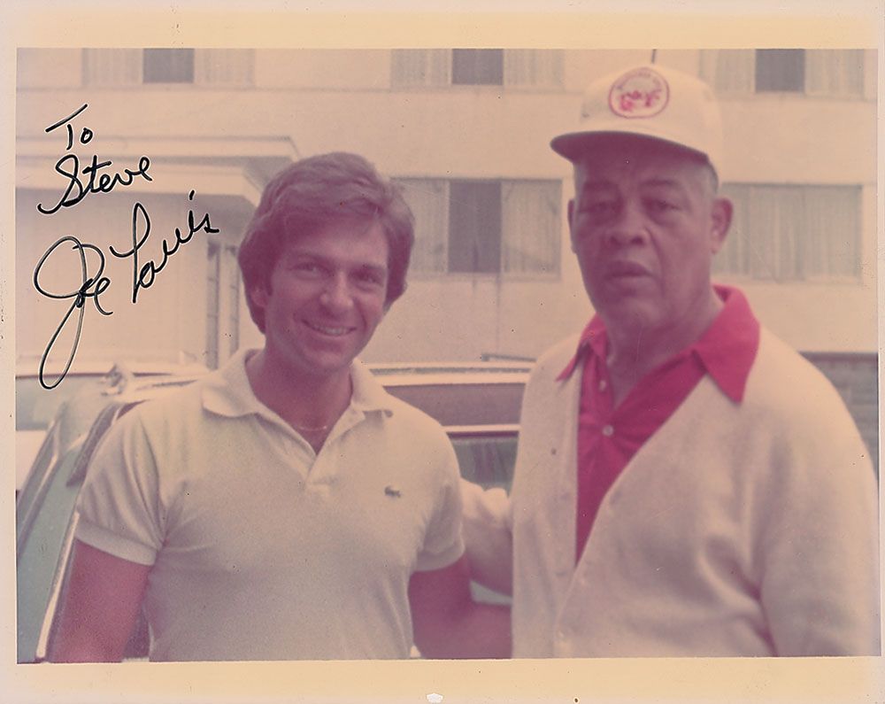 Color satin-finish 10 x 8 candid photo of Louis posing outside with another man, signed and inscribed in black felt tip, “To Steve, Joe Louis.” In fine condition, with a light water spot to lower portion of image.