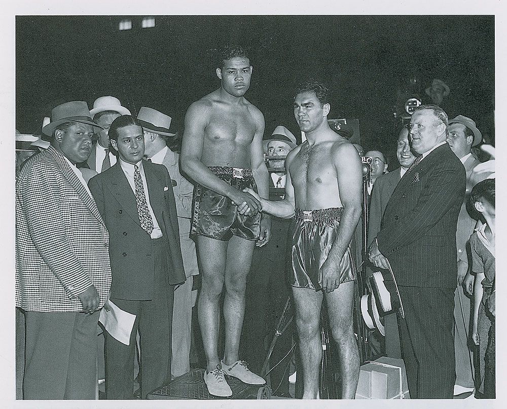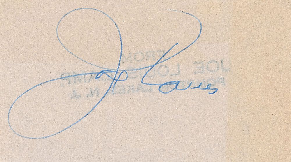 Ballpoint signature, “Joe Louis,” on an off-white 4 x 2.25 slip. Reverse bears a stamp that reads, “From Joe Louis Camp, Pompton Lakes, N. J.” In fine condition, with a light band of toning to right border (not affecting the signature).