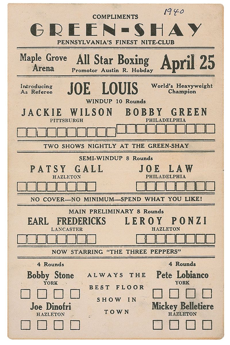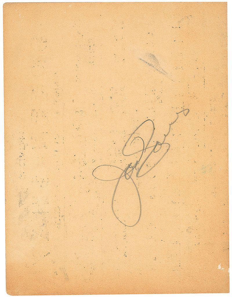 Vintage 1940 scorecard for a series of boxing matches featuring Louis as the referee, 5.5 x 8.5, signed on the reverse in pencil, “Joe Louis.” Lower portion is affixed to a black 7.25 x 5.75 board. In fine condition, with scattered marks and toning to signed area and a central horizontal fold.