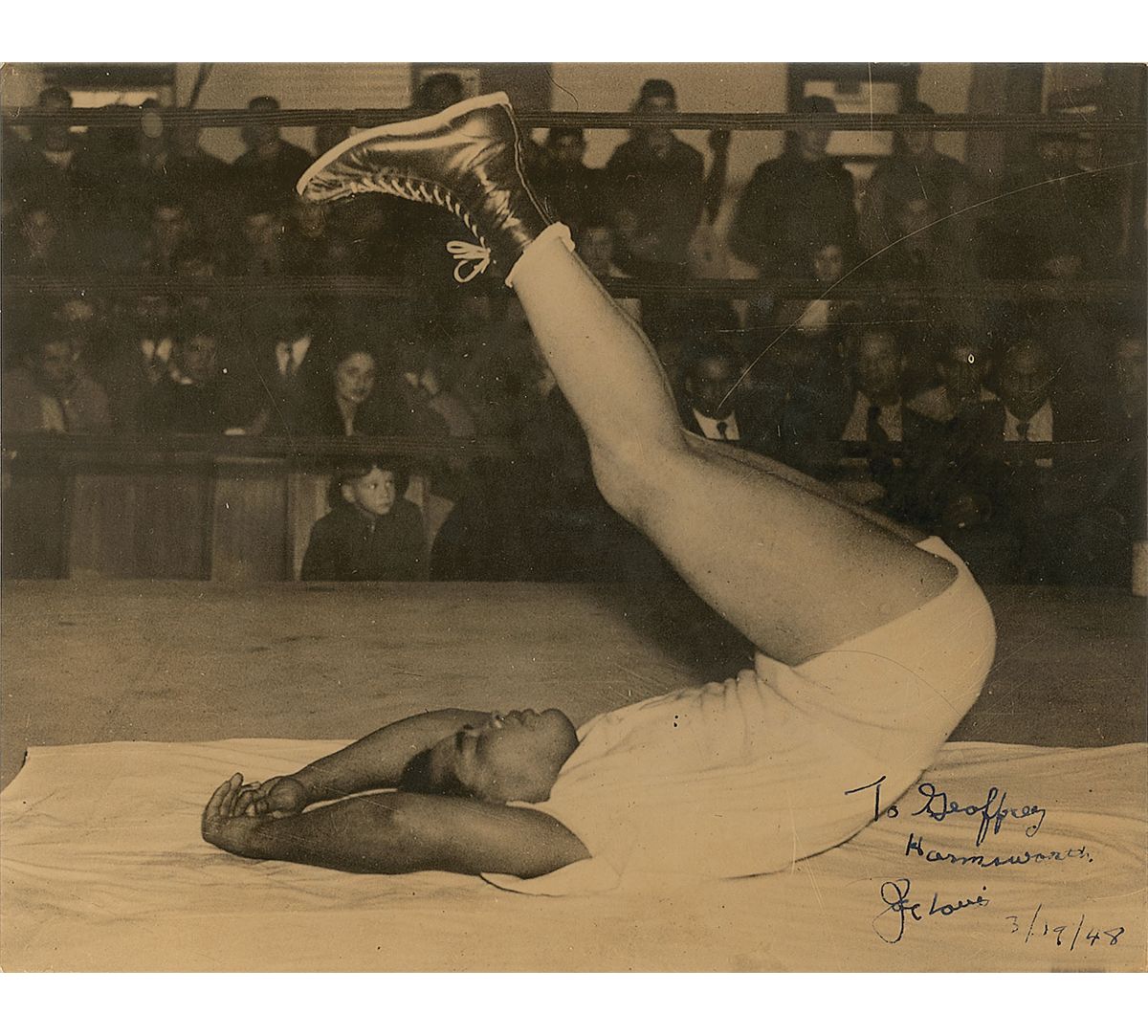 Desirable vintage matte-finish 10 x 8 photo of Louis stretching as champ, three months before the Walcott fight, signed and inscribed in fountain pen, “To Geoffrey Harmsworth, Joe Louis, 3/19/48.” In fine condition, with a few surface marks and impressions and slight irregular adhesion to the inscription and signature.