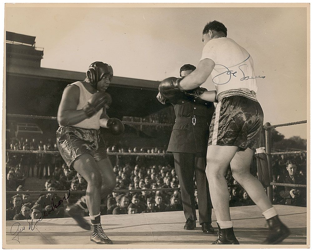 Extraordinary matte-finish 9.5 x 7.75 photo of Louis facing off against his longtime sparring partner George Nicholson, signed by both in fountain pen, “Joe Louis” and “Geo. Nicholson.” Reverse bears the photographer’s stamp of G. G. Holt. Scattered surface creases and slightly trimmed edges, otherwise fine condition.