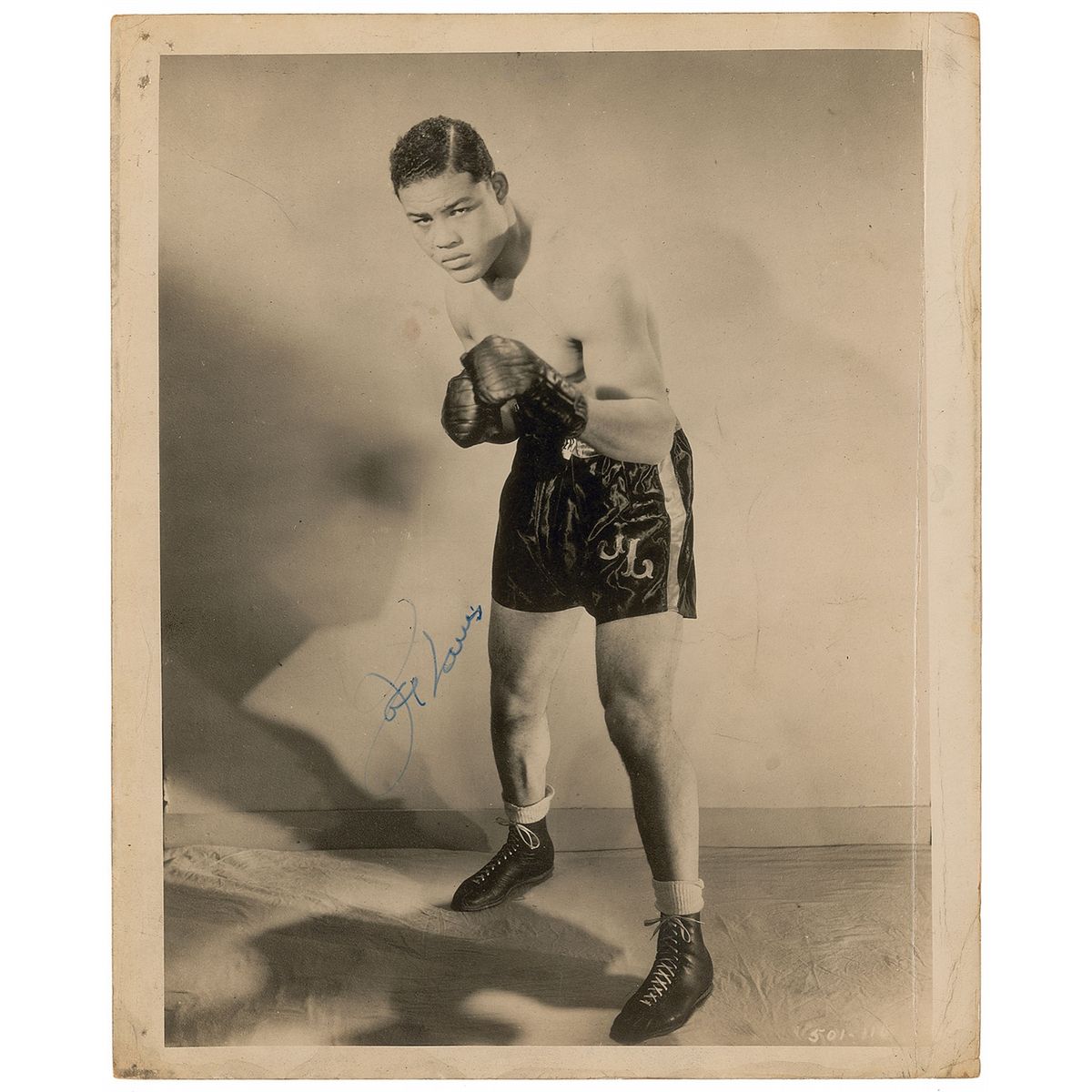 Classic vintage glossy 8 x 10 full-length photo of Louis striking a pugilistic pose, signed in fountain pen. In very good condition, with a vertical fold to the right border, moderate to heavy overall creases, soiling to borders, several tack holes to corners, and the first letter of the signature a few shades light.