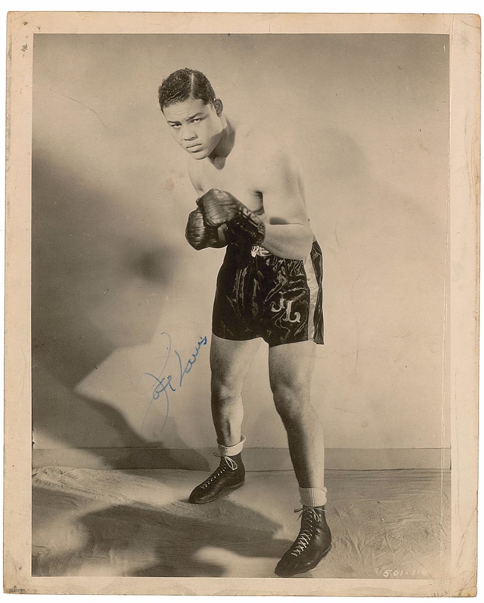 Fantastic vintage glossy 8 x 10 full-length photo of Louis in his classic boxing pose, signed as the heavyweight champion in blue ink. In very good condition, with a vertical fold along right border, scattered creases and surface marks, and pin holes to left corners. A wonderful depiction of the legendary fighter, who went on to defend his heavyweight belt a record 25 times.
