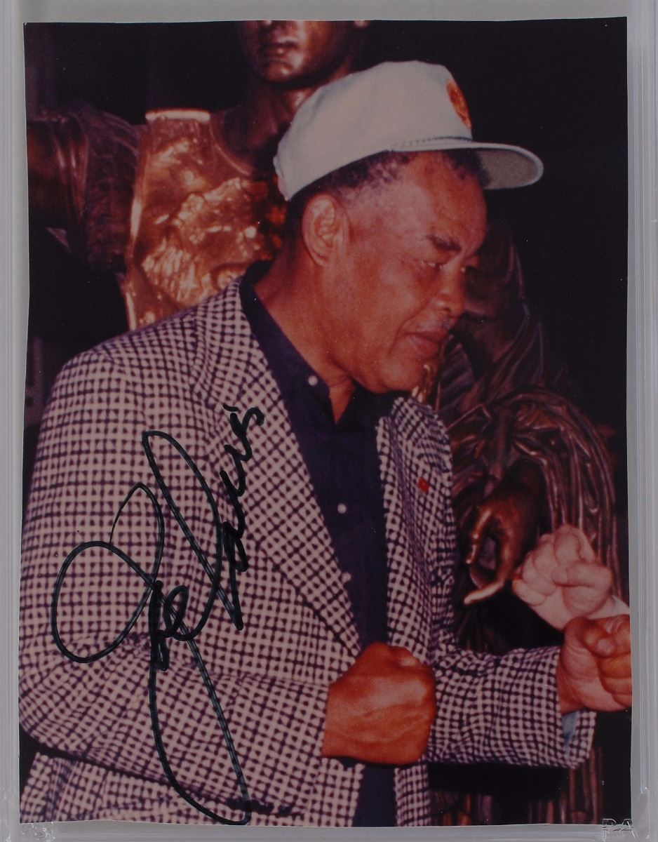 Color glossy 3.5 x 4.75 photo of Louis striking a boxing pose in later age, signed in black felt tip. Encapsulated in a plastic PSA/DNA authentication holder. In fine condition, with trimmed edges.