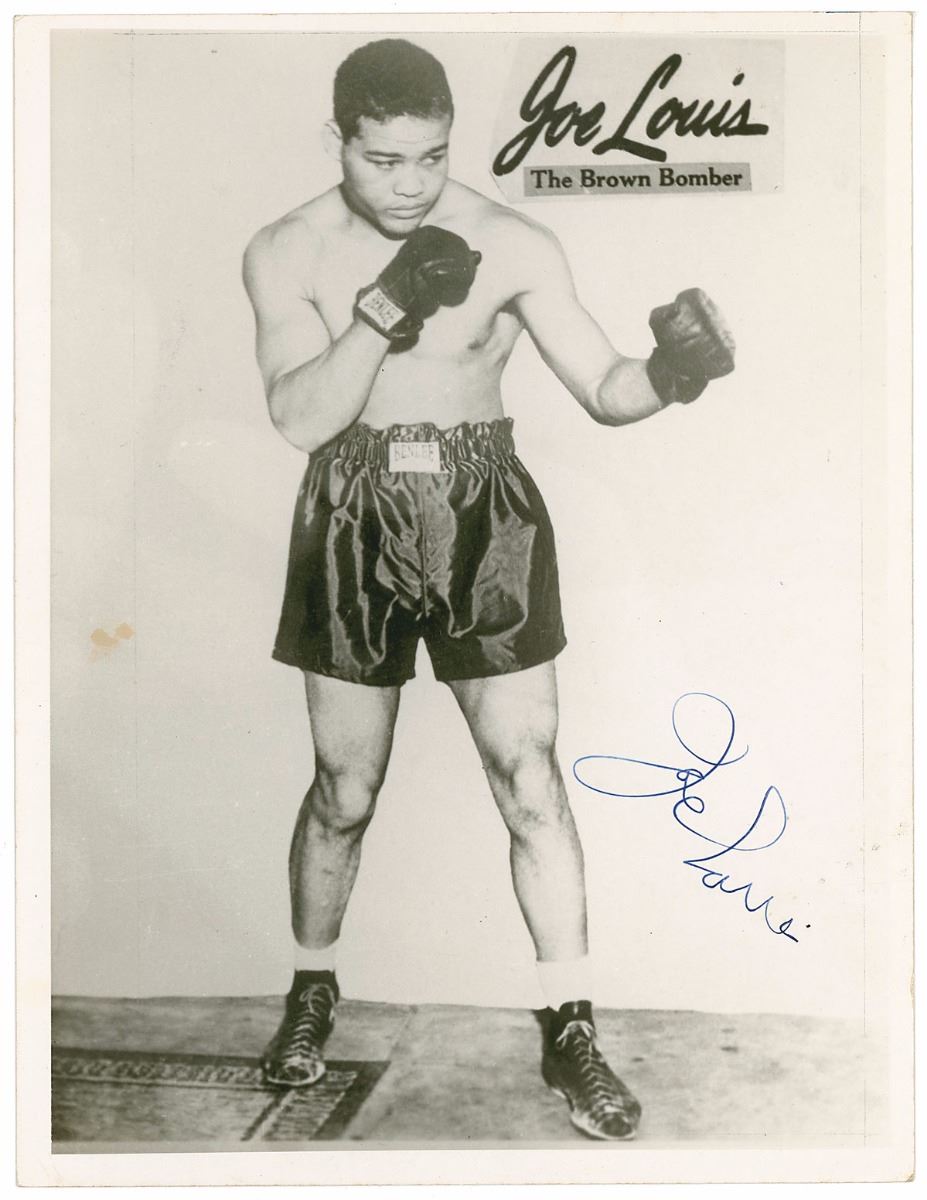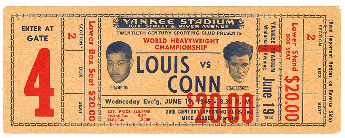 Vintage 6.5 x 8.5 full-length photo of Louis in his prime, signed in blue ink. Accompanied by an original unused $20 onsite full lower box ticket to Louis’s title-defending rematch bout against Billy Conn at Yankee Stadium on June 19, 1946. In fine condition. Louis would knock out an unimpressive Conn in the eighth round.