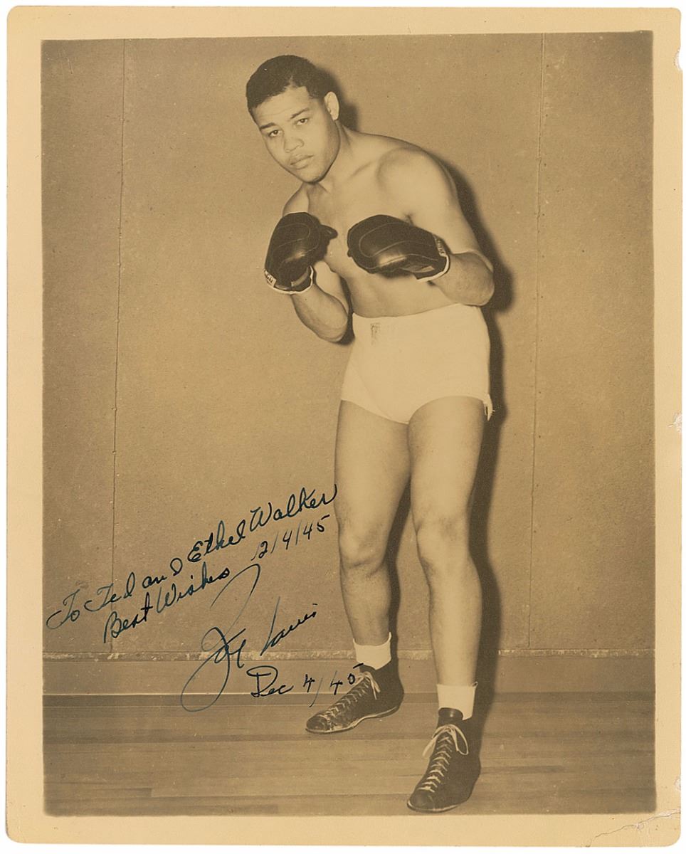 Vintage matte-finish 8 x 10 full-length photo of Louis in his prime, signed in fountain pen as the heavyweight world champion, “Joe Louis, Dec 4/45.” The inscription, “To Ted and Ethel Walker, Best wishes, 12/4/45,” is written in another hand. A crease to the lower right corner and three binder dings to the right edge, otherwise fine condition. A great vintage photo of the Brown Bomber.