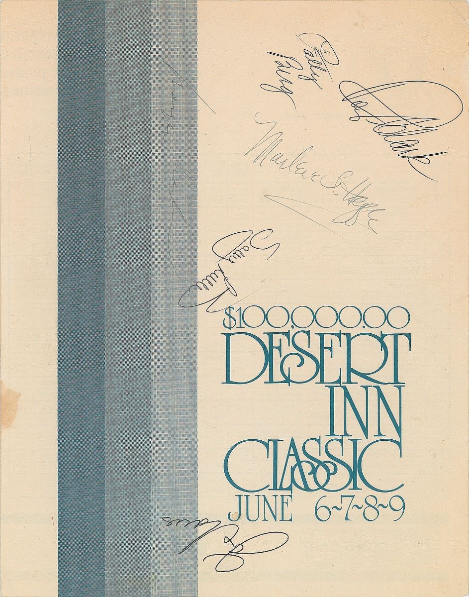 Program for the $100,000 Desert Inn Classic in Las Vegas for June 7, 1974, measures 8.5 x 11, signed on the front cover in black ballpoint by Joe Louis. Also signed by Sally Little, Patty Berg, Marlene Hagge, Margie Masters, and Roy Clark. In fine condition, with some light stains and creases.