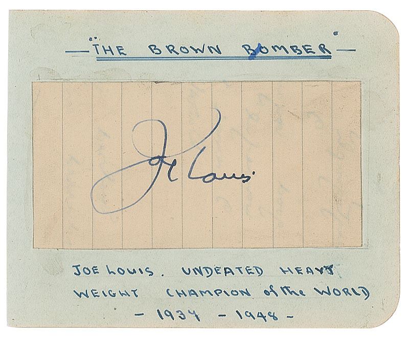 Vintage fountain pen signature, "Joe Louis,” on an off-white 3.75 x 2 lined slip affixed to an album page. In fine condition.