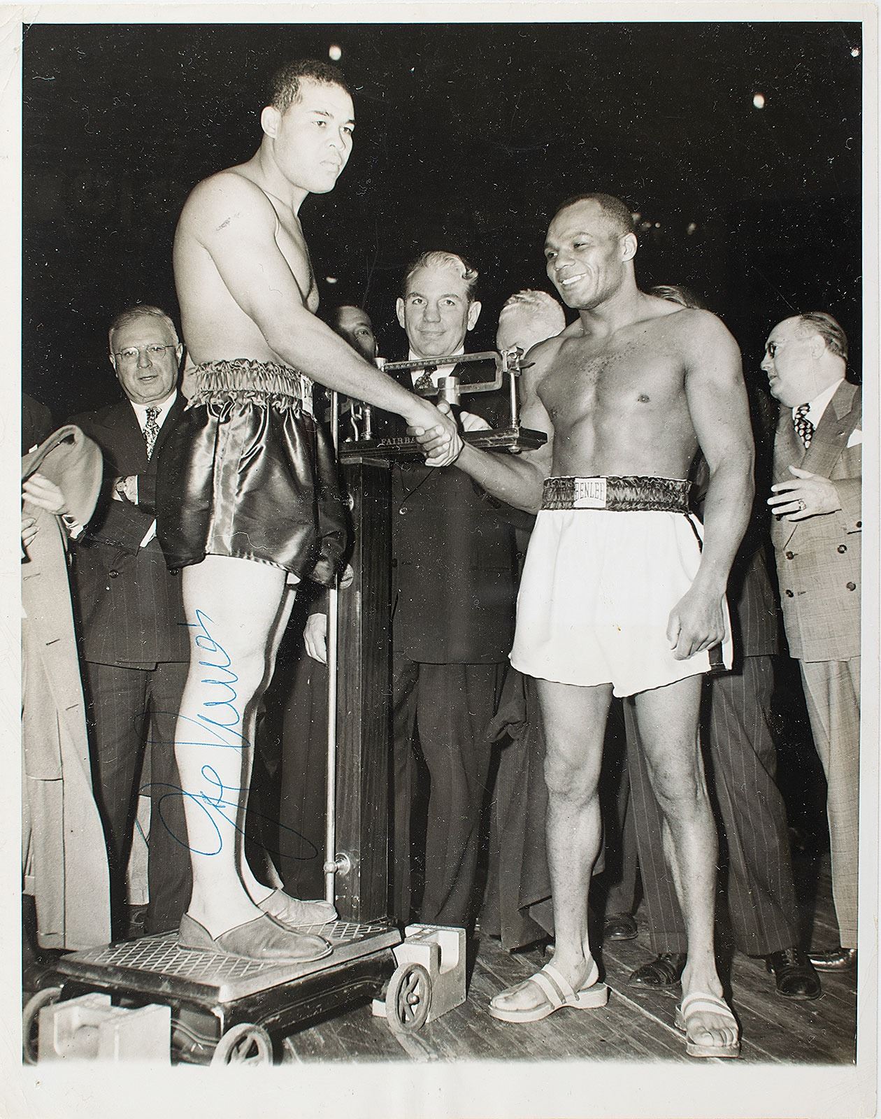 Vintage glossy 7 x 9 full-length photo of Joe Louis shaking hands with Jersey Joe Walcott at weigh-ins before their 1947 bout, signed vertically on his legs in blue ballpoint by Louis. Reverse bears an affixed Associated Press caption and stamp, and collector's notations: "Joe Louis autographed this photo at the Boxing Writers Dinner in N.Y. at the Waldorf Astoria, 1/14/60." In very good to fine condition, with scattered creasing.