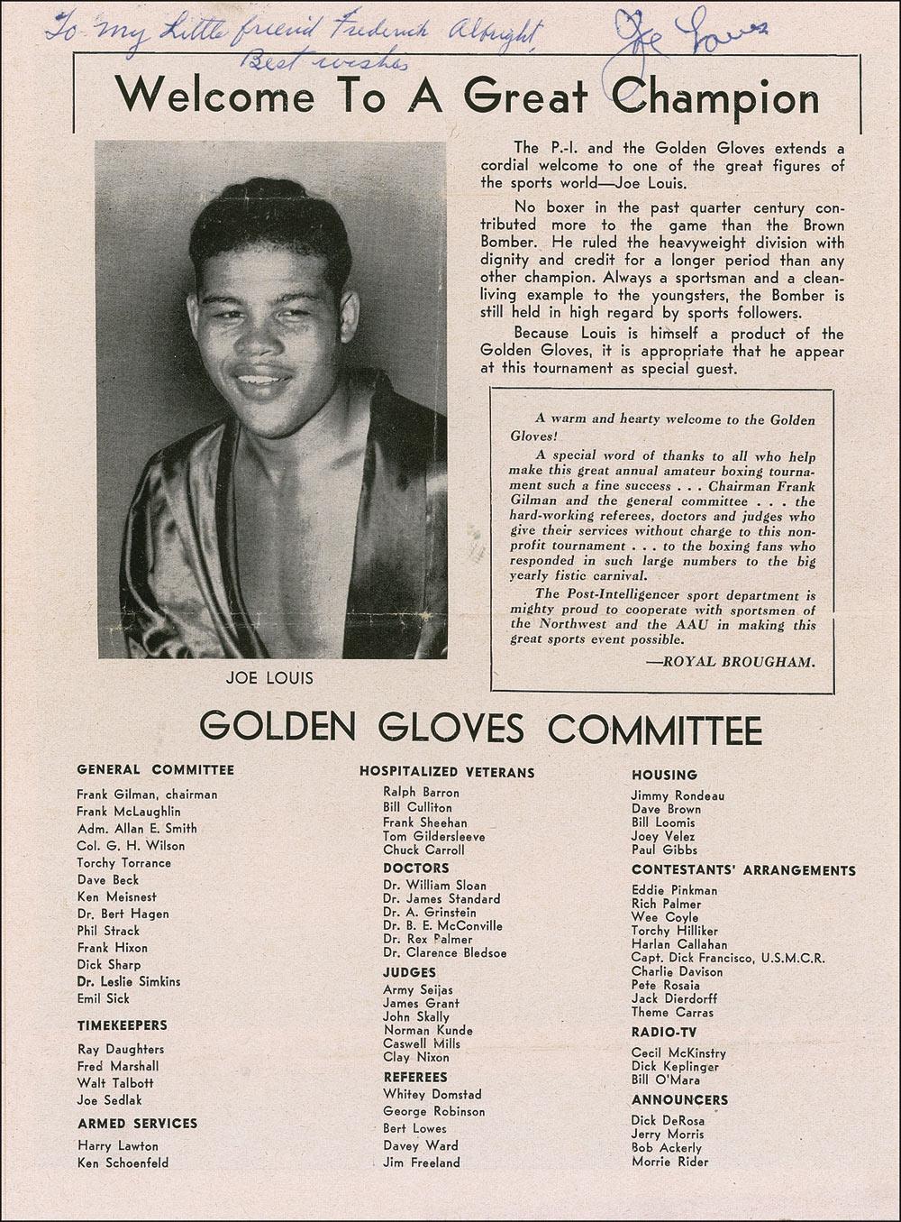 Vintage program from the 18th Annual Golden Gloves Tournament held in Seattle, Washington in February 1953, 7.5 x 10, two pages. Signed on the inside page above a welcome message to Louis, “Joe Louis,” and inscribed in another hand “To my little friend Frederick Albright, Best wishes.” Accompanied by a 1953 letter of provenance from the man who acquired the signature. He writes, “I had Joe Louis as a guest referee and it was a big show with the best boxers from the west. So I thought I would send Freddie…a program which he autographed.” Intersecting storage folds and handling wear to program, otherwise fine condition. Pre-certified Steve Grad/PSA/DNA and RRAuction COA.