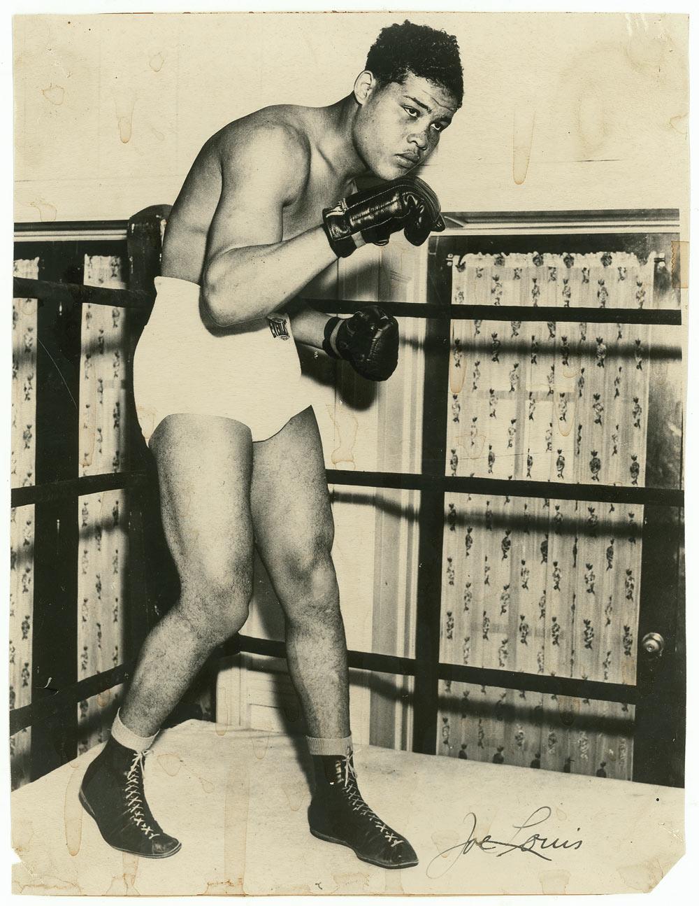 Vintage glossy 7.25 x 9.5 photo of Louis training in the ring, signed in black ink. Tack holes to each corner, missing lower right corner tip, scattered creasing and toning at top from mounting remnants on reverse, and some scattered soiling to bottom portion, otherwise very good condition. Pre-certified Steve Grad/PSA/DNA and RRAuction COA.