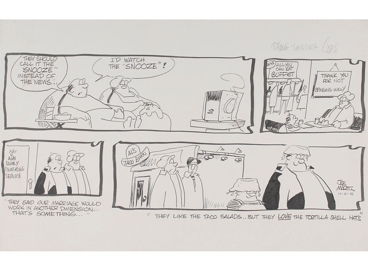 Four original hand-inked single-panel Willy ’N Ethel comics on a 22 x 14 off-white sheet of artist’s cardstock. The last panel is signed in black ink, “Joe Martin, 10-31-99,” and signed and inscribed again in pencil in the upper border, “To Frank—Good luck—Joe.” In fine condition.