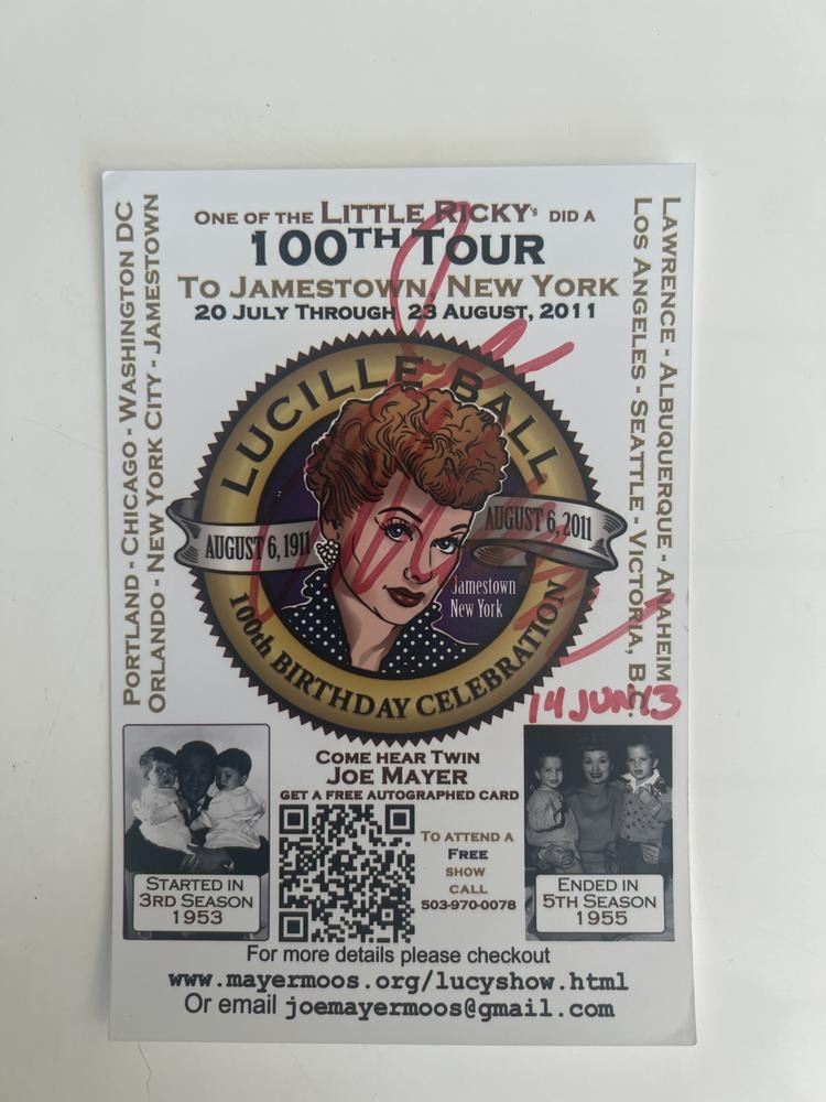 Joe Mayer signed Lucille Ball 100th Birthday Celebration card. One of the Little Ricky. 14-Jun-13. 4x6 inches