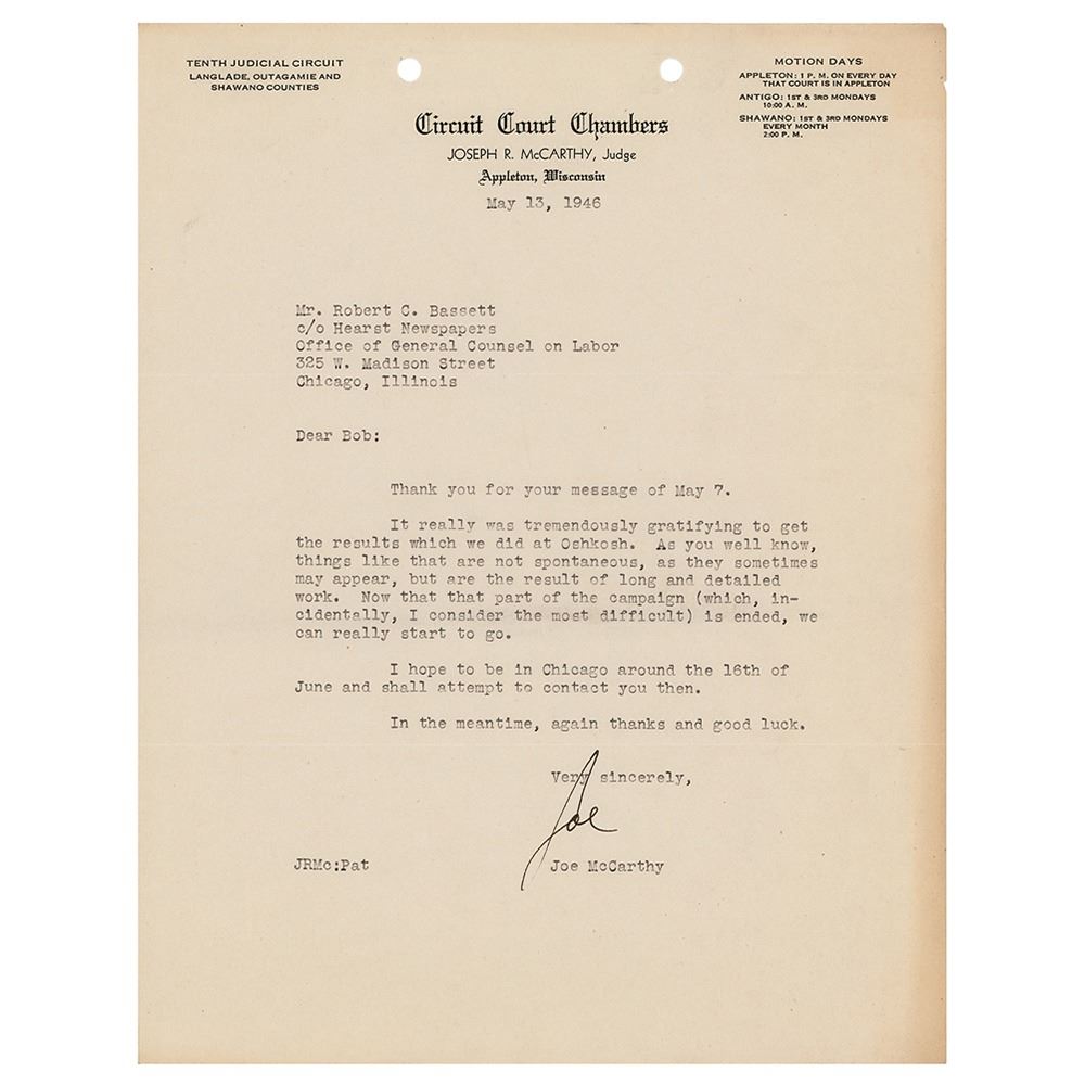 TLS signed “Joe,†one page, 8.5 x 11, personal Circuit Court Chambers letterhead, May 13, 1946. Letter to Robert C. Bassett of the Hearst Newspapers, in part: “It was tremendously gratifying to get the results which we did at Oshkosh…things like that are not spontaneous…but the result of long and detailed work. Now that that part of the campaign (which, incidentally, I consider the most difficult) is ended, we can really start to go. I hope to be in Chicago around the 16th of June and shall attempt to contact you then.†In fine condition, with two file holes to the top edge. Although McCarthy served as Judge of the 10th Circuit Court of Wisconsin from 1940-47, he spent the bulk of this time fighting in World War II (1942-45) in the Pacific as an officer with the U.S. Marines. The letter refers to an important leg of his ultimately successful campaign for the U.S. Senate; he took his seat as a U.S. Senator eight months later on January 3, 1947.