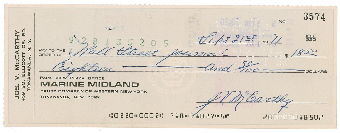 Personal check, 8.25 x 3, filled out and signed by McCarthy “J. V. McCarthy,” payable to Wall Street Journal for $18.50, September 21, 1971. A central vertical fold, a few wrinkles, expected bank stamps and punches with show-through from a stamp on the reverse touching his first two initials, otherwise fine condition.