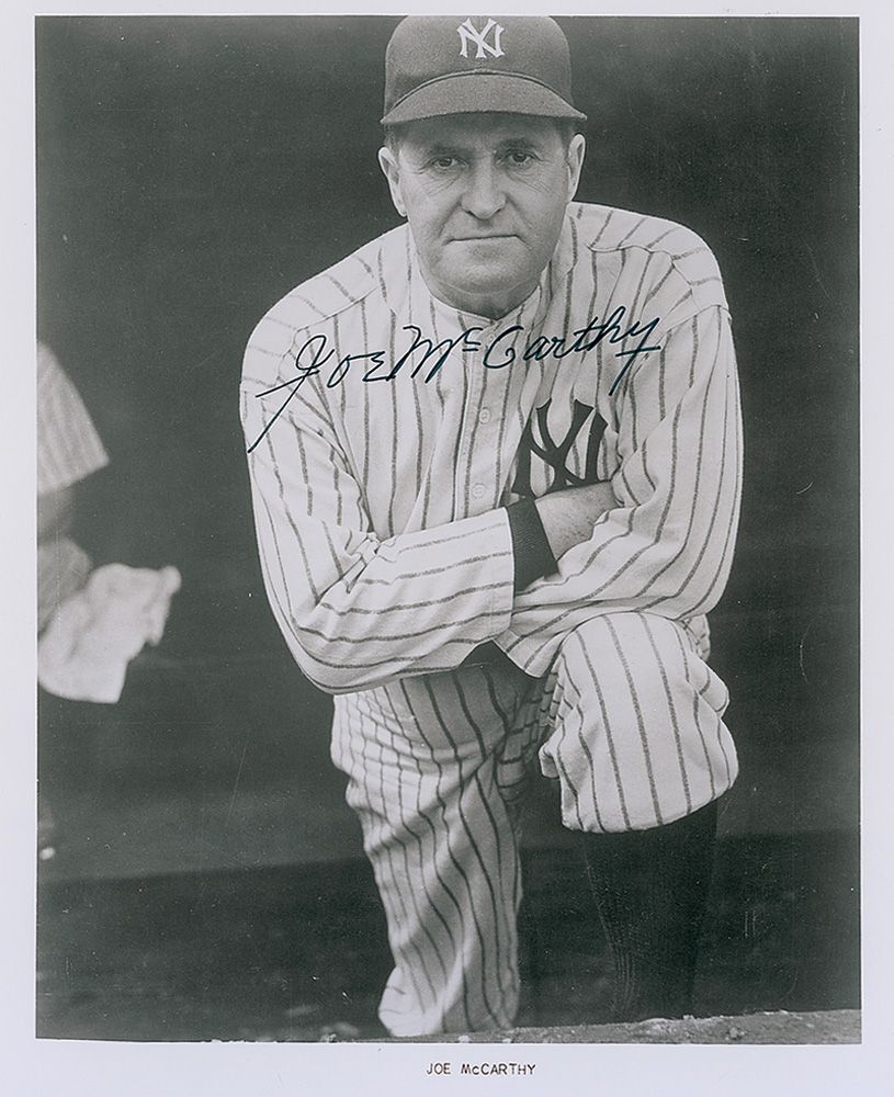 Glossy 8 x 10 photo of McCarthy posing in the dugout in his Yankee pinstripes, signed in black felt tip. In fine condition, with a few scattered light creases.