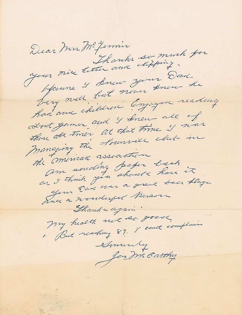 ALS, one page, 8.25 x 11, no date. Letter to the daughter of fellow Hall of Famer Rabbit Maranville. In part: “Of course I knew your Dad very well but never knew he had any children. Enjoyed reading about gamer and I knew all of those old timers. At that time I was managing the Louisville club in the American association…My health not so good, but reaching 87 I can’t complain.” In very good condition, with intersecting folds, one through a single letter of signature, and another one directly under signature and scattered toning.