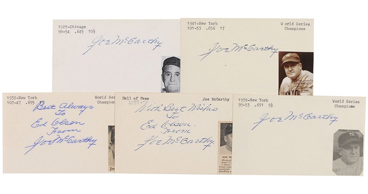Five ballpoint signatures, two inscribed, on individual off-white 5 x 3 cards, each with typed collector’s notations and a clipped photo affixed to lower right corner. In fine condition.