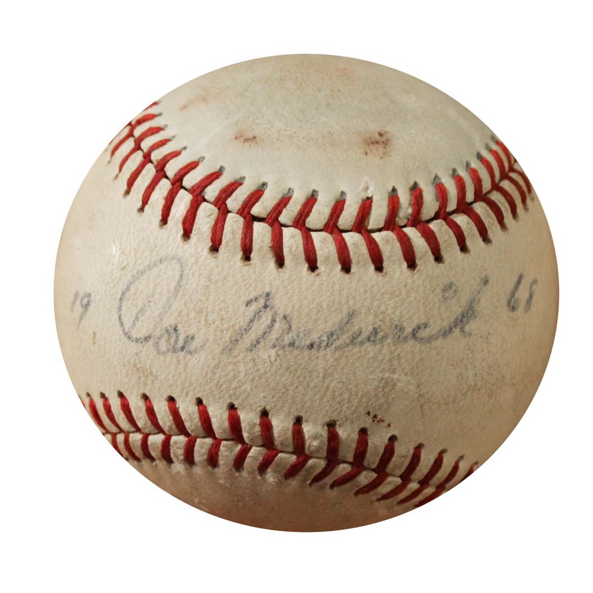 Official American League baseball single-signed by Joe Medwick in 1968, the year he was inducted into the Baseball Hall of Fame. The 1934 Gashouse Gang's left fielder signs in blue ink on the sweet spot: ''19 Joe Medwick 68''. Baseball is stamped with the signature of Joseph E. Cronin, League President. With JSA COA. In very good condition.