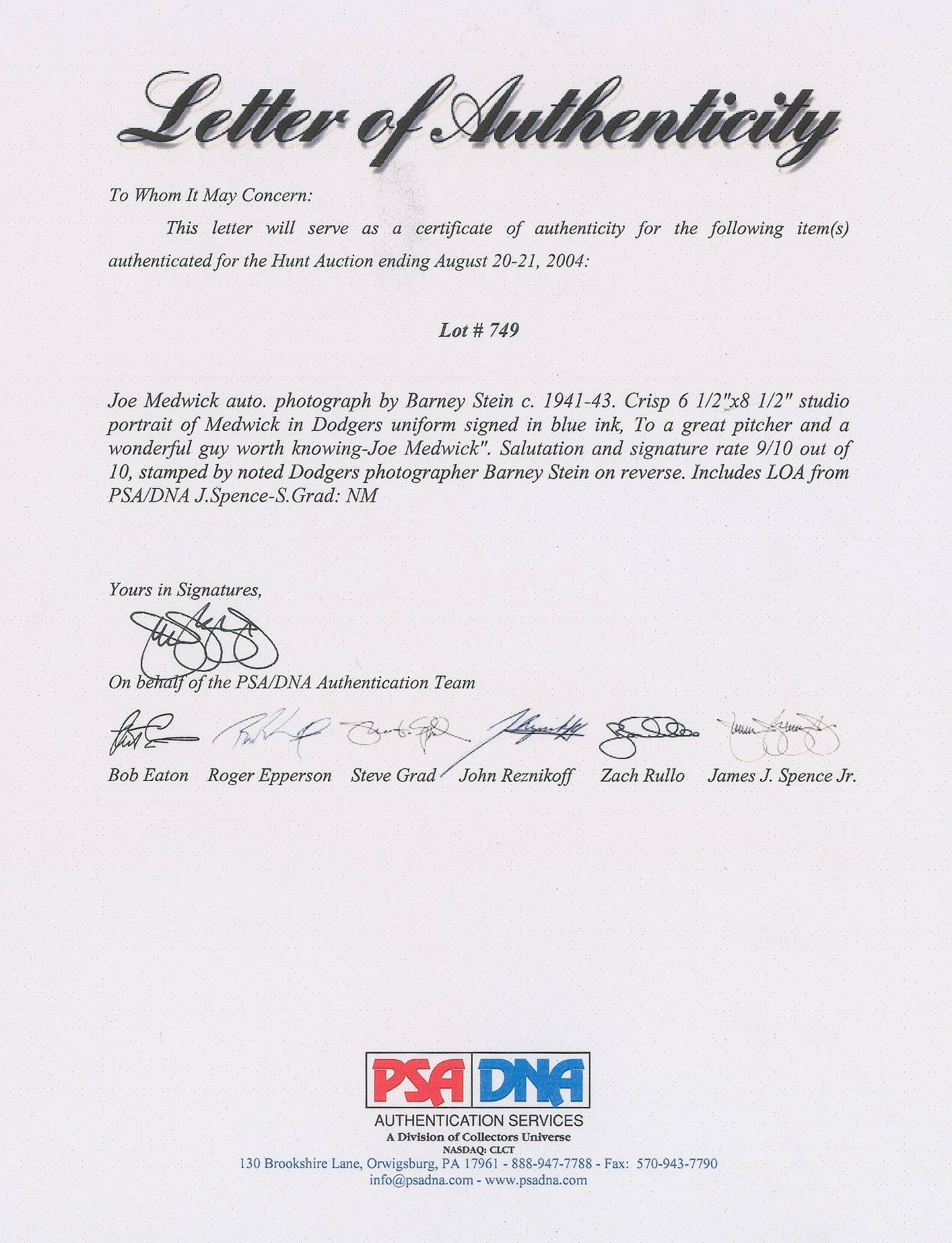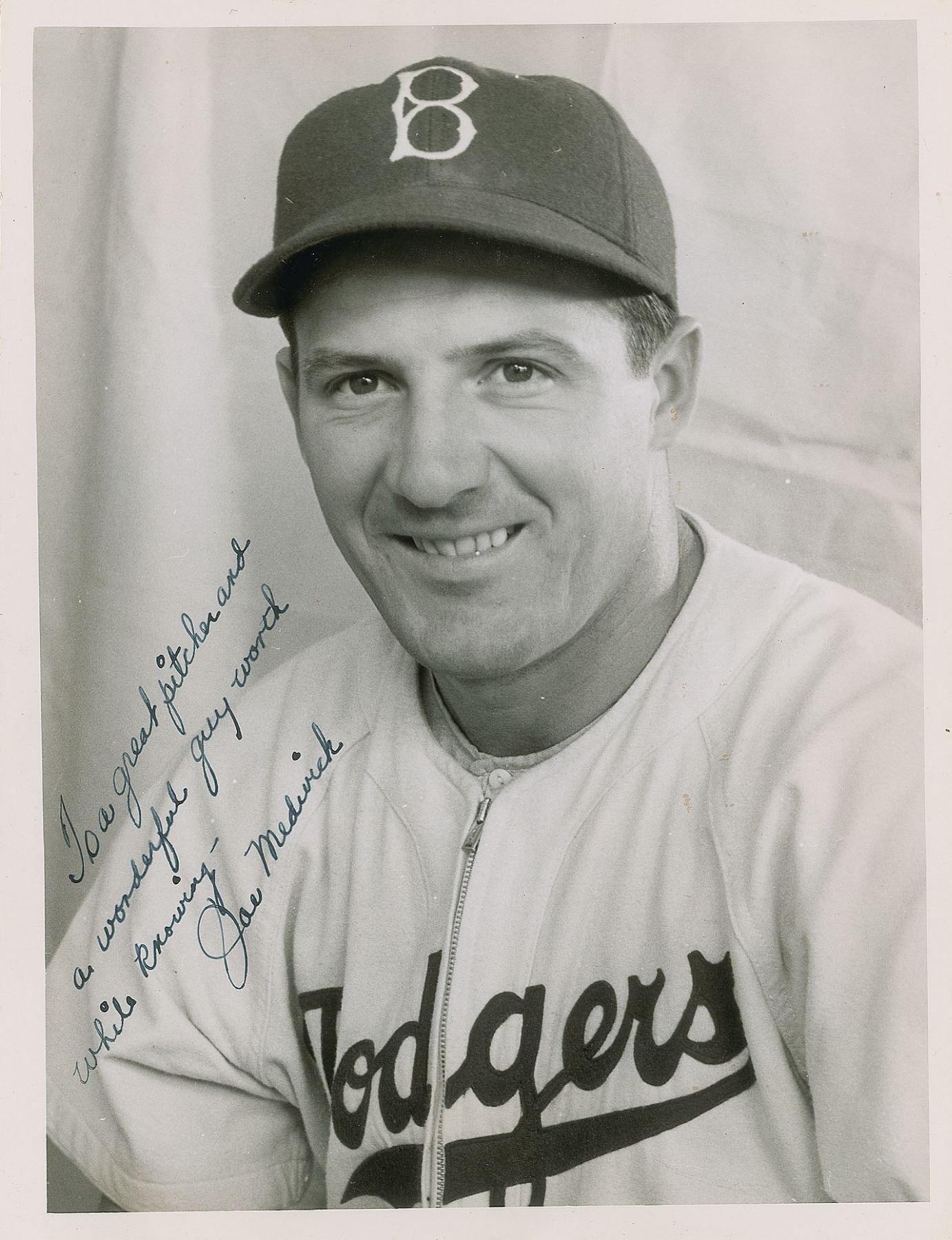 Vintage pearl-finish 6.5 x 8.5 photo of the Hall of Fame left fielder posing in his Brooklyn Dodgers uniform, signed and inscribed in fountain pen, "To a great pitcher and a wonderful guy worth while knowing—Joe Medwick.” Reverse bears a Barney Stein stamp. In fine condition, with a few surface impressions.
