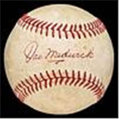 Rawlings Official Midwest League baseball single-signed in black fountain pen on the sweet spot by HOF outfielder Joe "Ducky" Medwick. Ball shows nice wear with toning and soiling, possibly game-used, signature grades a 7. Accompanied by a LOA from JSA.