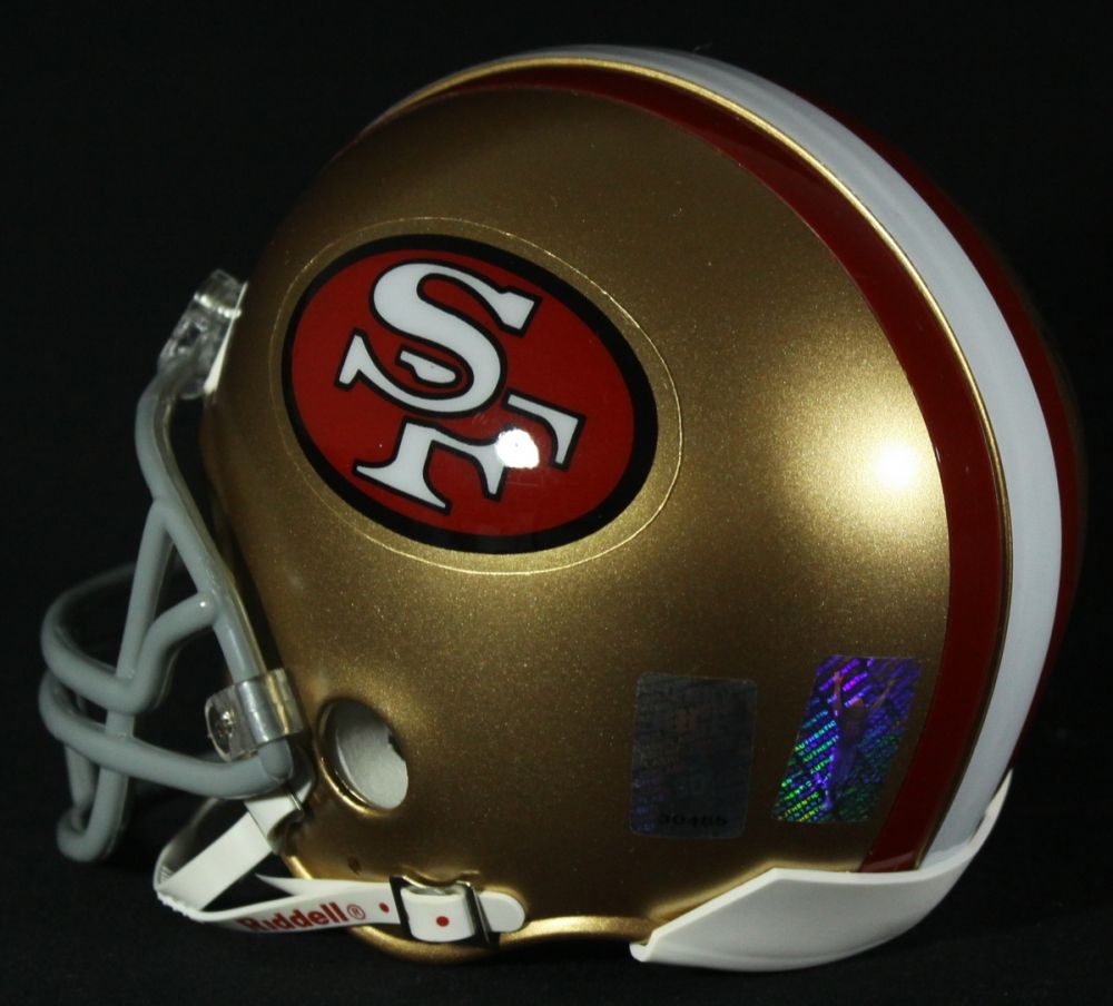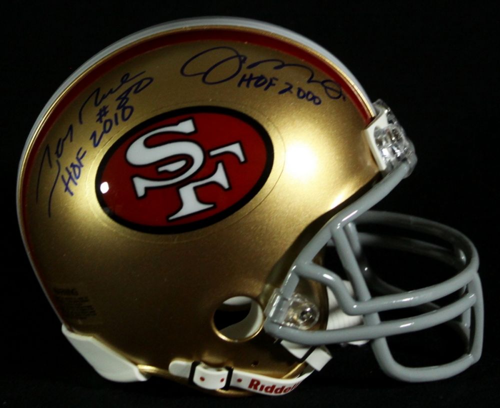 Riddell mini 49ers helmet. Hand-signed and inscribed in blue felt tip pen by Joe Montana "HOF 2000" and Jerry Rice "#80, 2010 HOF". Autographs includes official Jerry Rice and Joe Montana player holograms for authenticity purposes.